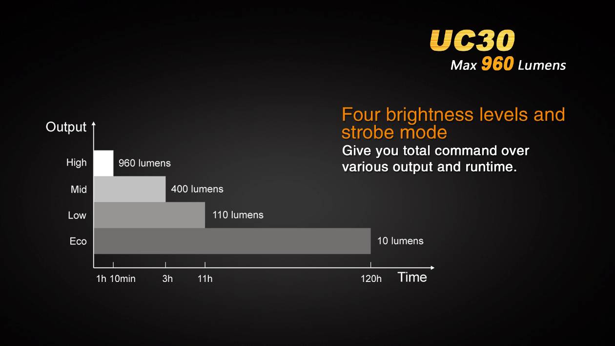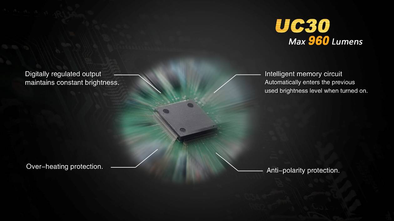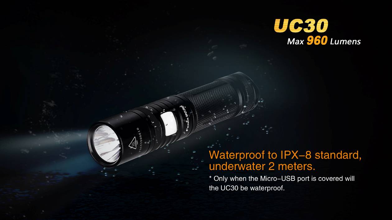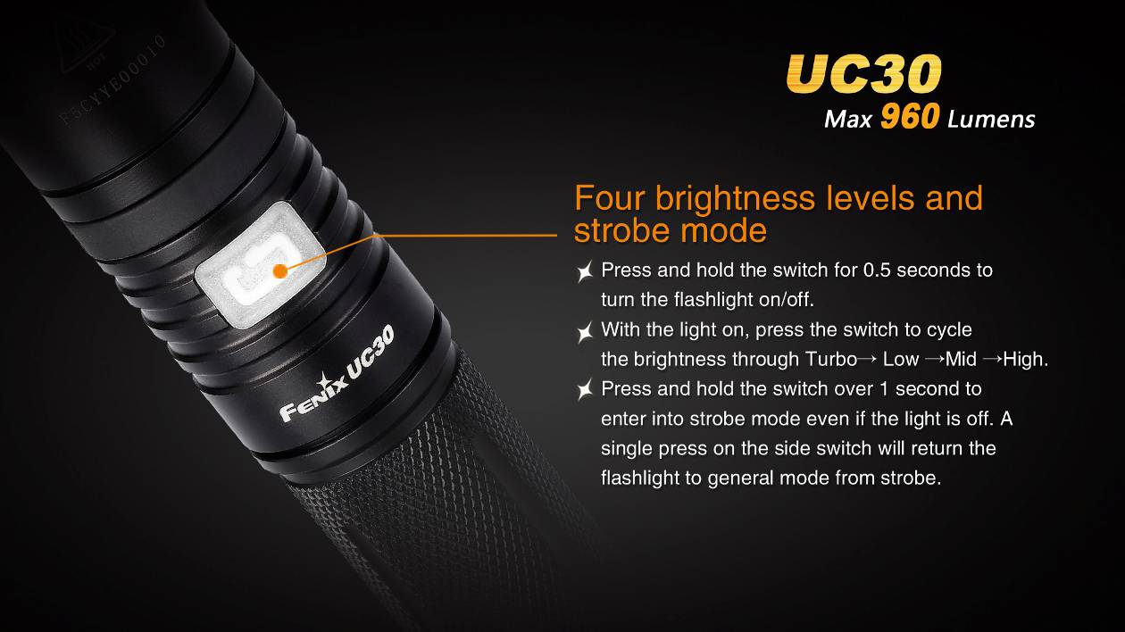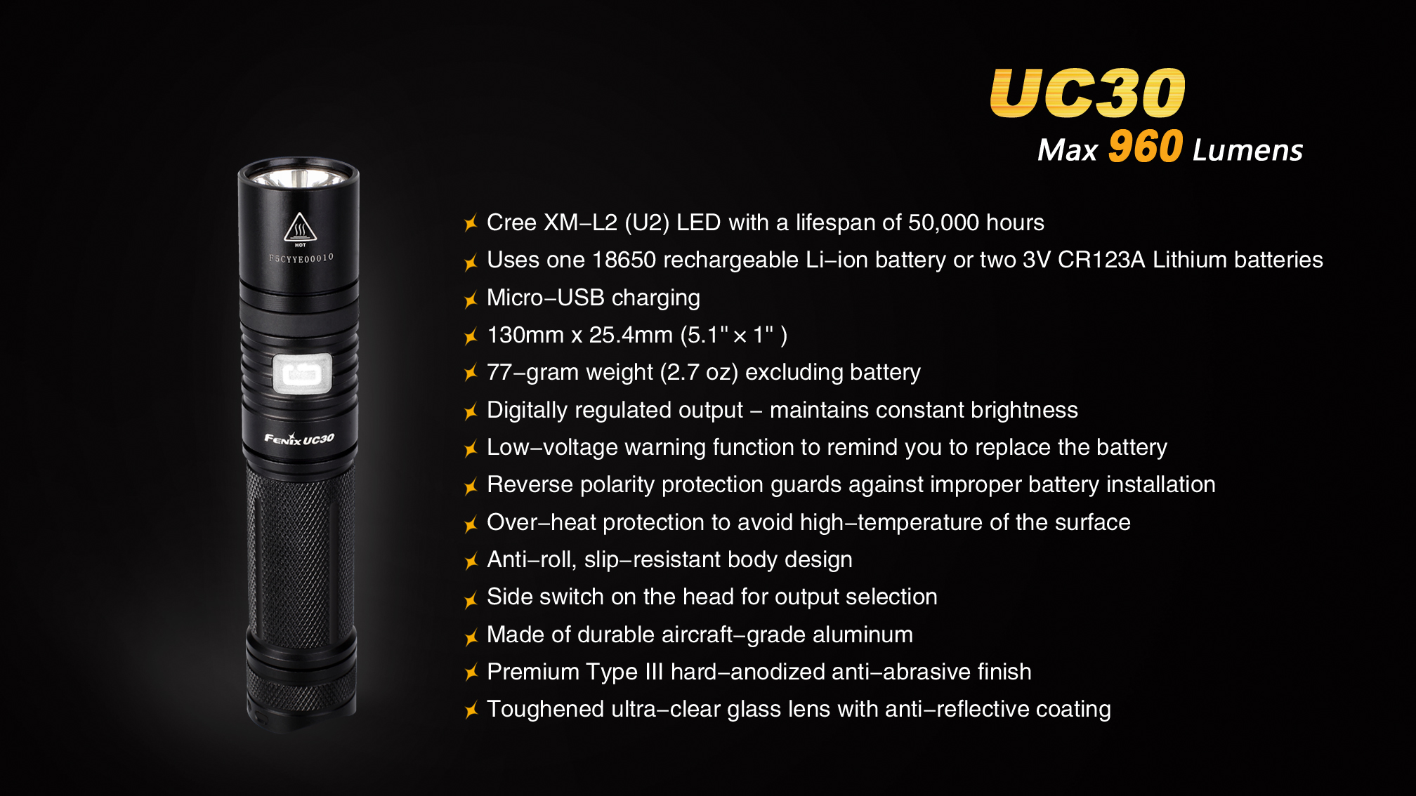 Fenix UC30je jednoduchá nabíjacia baterka, ktoré ponúka svetelný tok až 960 lúmenov. Svetelná dióda Cree XM-L2 U2 v kombinácii s hliníkovým reflektorom dosvieti až do vzdialenosti 204 metrov. Na napájanie používa li-ion akumulátor typu 18650 s kapacitou 2600 mAh, ktorý sa nabíja priamo v baterke. V núdzi je však možné na napájanie použiť aj dve jednorazové CR123A batérie. K dispozícii je celkom päť režimov osvetlenia s výdržou až 120 hodín v najnižšom režime. Zapnutie aj prepínanie svetelných funkcií sa vykonáva bočným tlačidlom pri reflektore baterky. Tento model je vhodný pre všetkých, ktorí hľadajú čo najmenšie a zároveň čo najvýkonnejšie nabíjacie svietidlo.