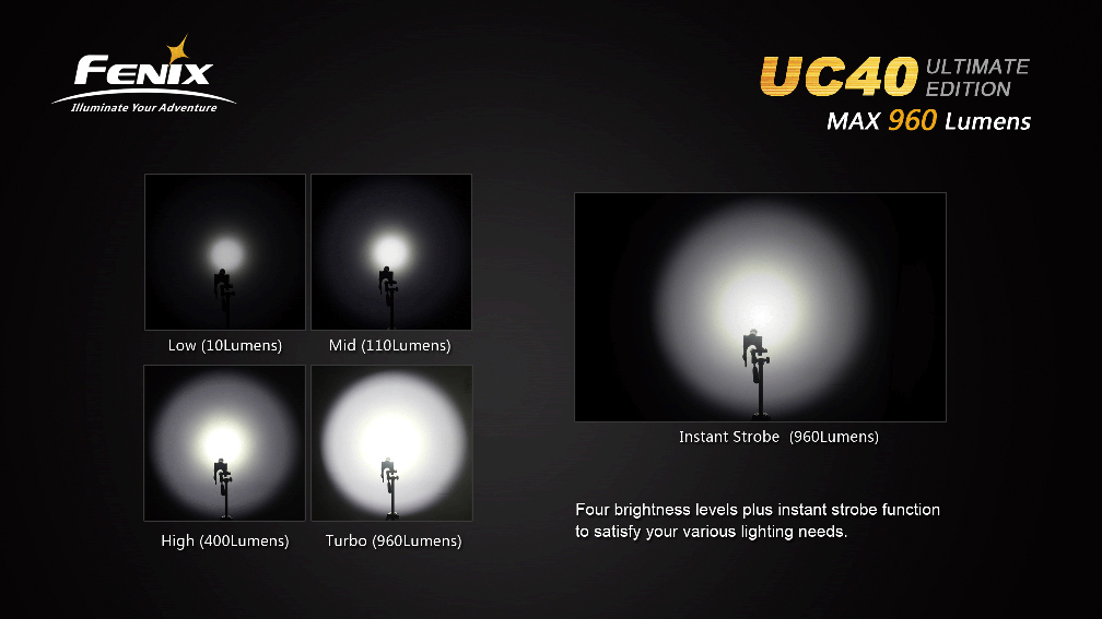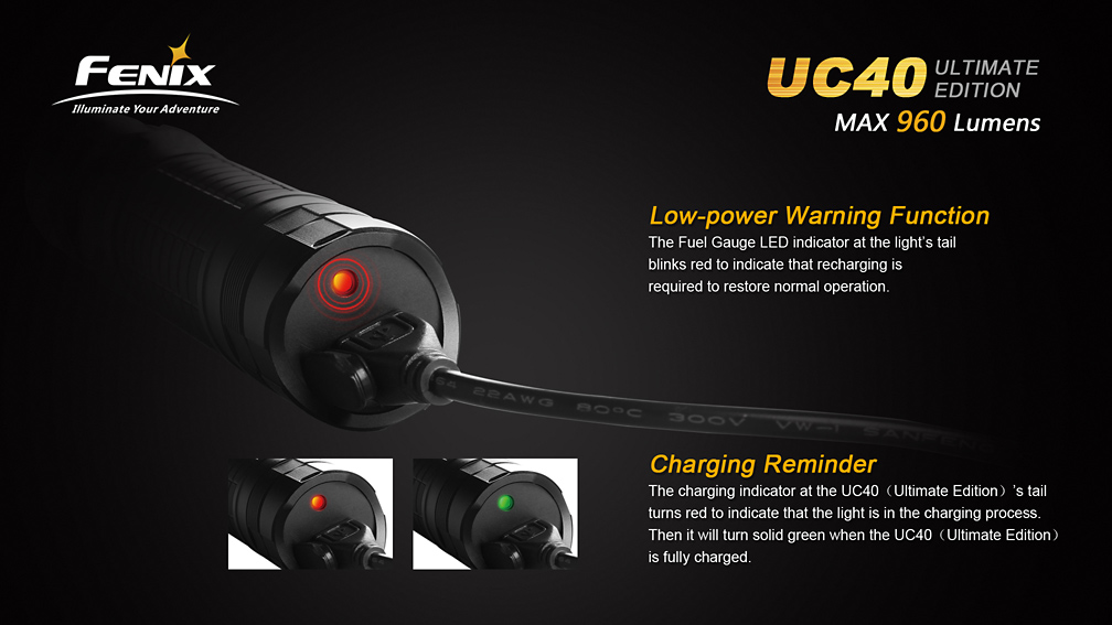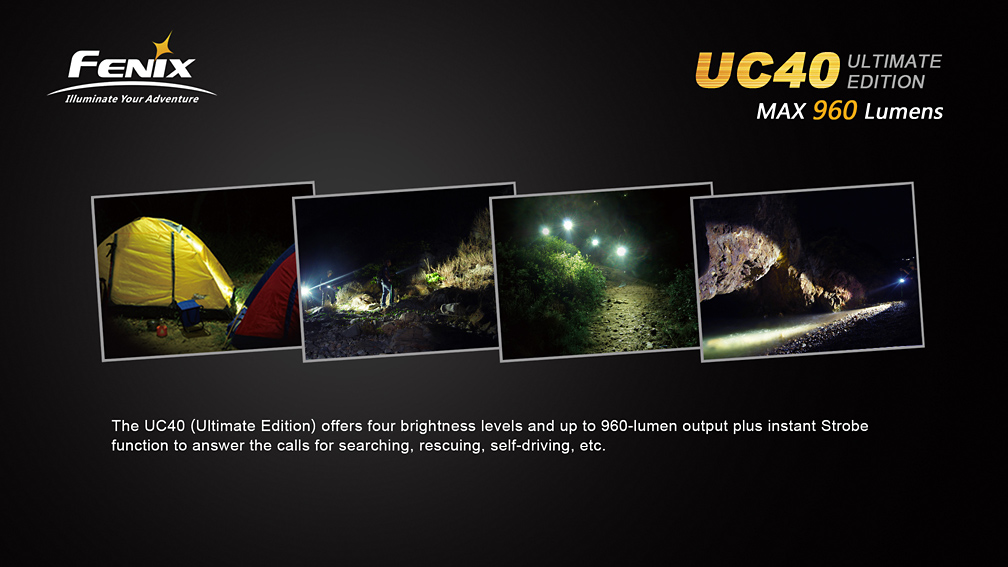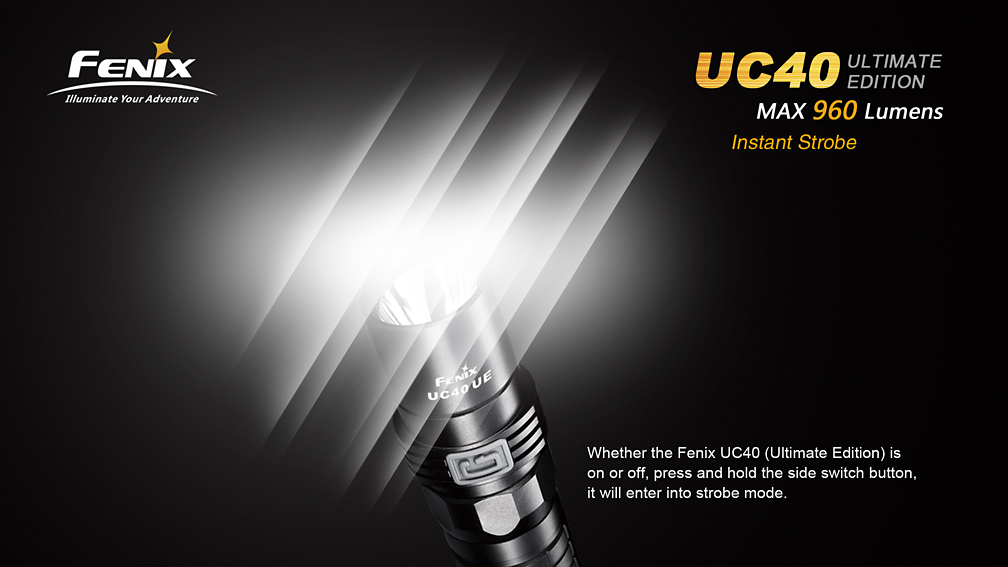 Fenix UC40 UE disponuje celkom piatimi režimami osvetlenia (vrátane stroboskopu) s výdržou až 150 hodín. Ovládanie svetla sa vykonáva bočným tlačidlom. V prípade, že je akumulátor takmer vybitý, rozbliká sa signalizačná dióda v koncovke svetla. Kompaktné rozmery, excelentný výkon a jednoduché nabíjanie patria medzi hlavné prednosti svietidla Fenix UC40 UE, ktoré mu zaisťujú veľmi široké uplatnenie.
