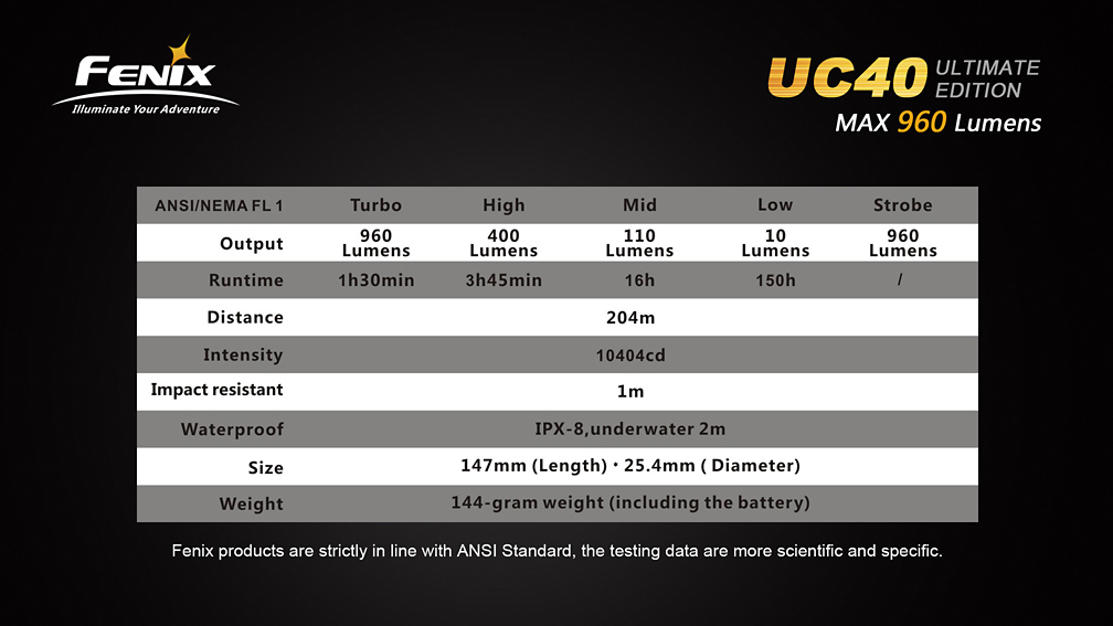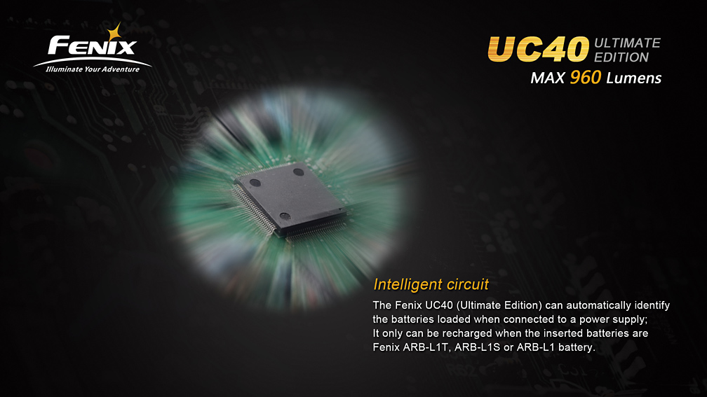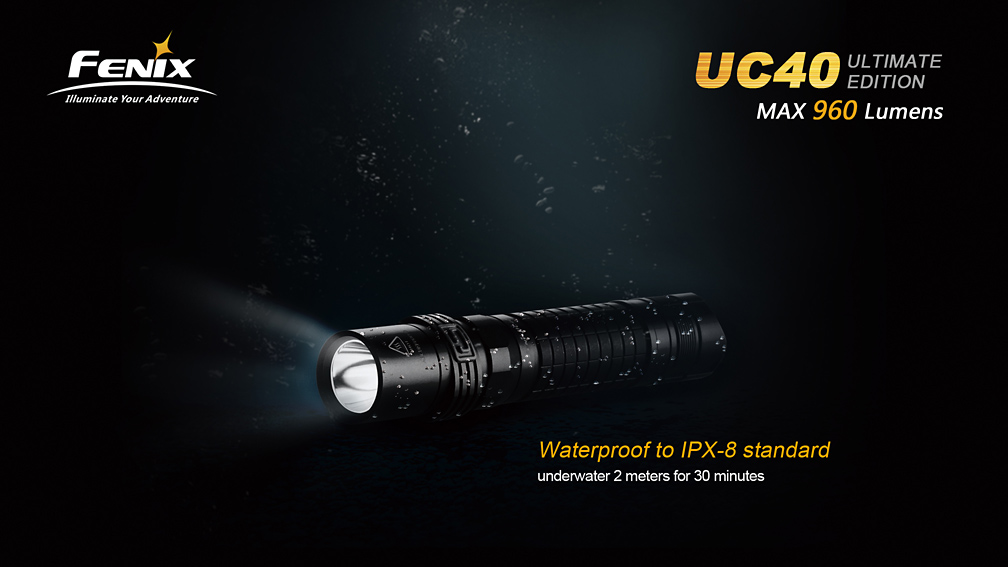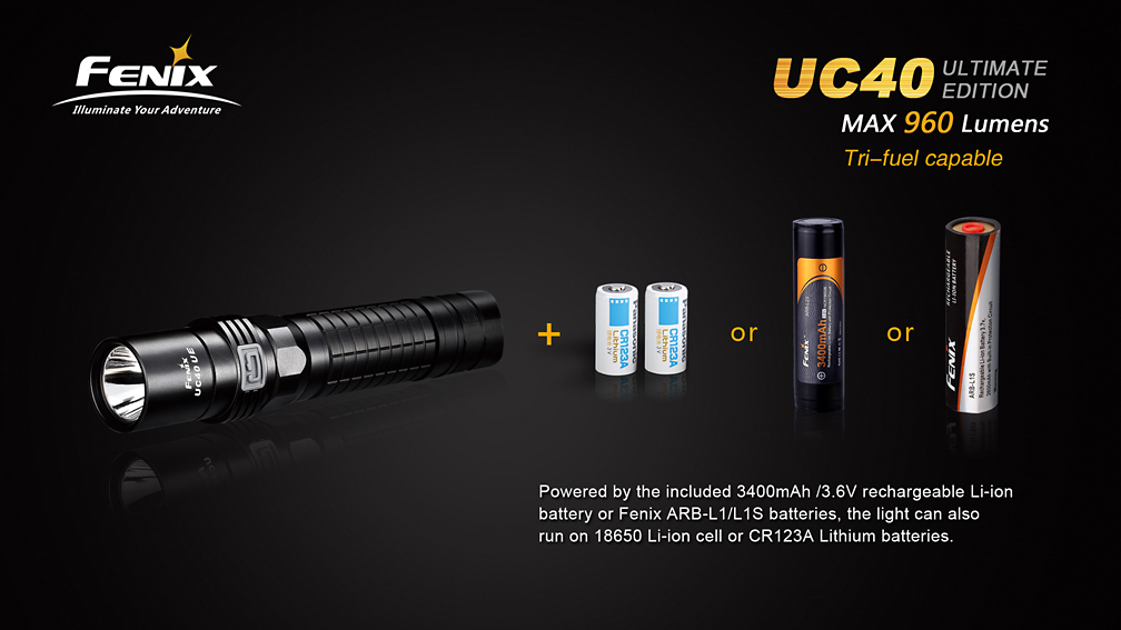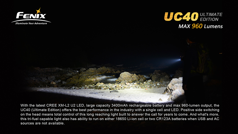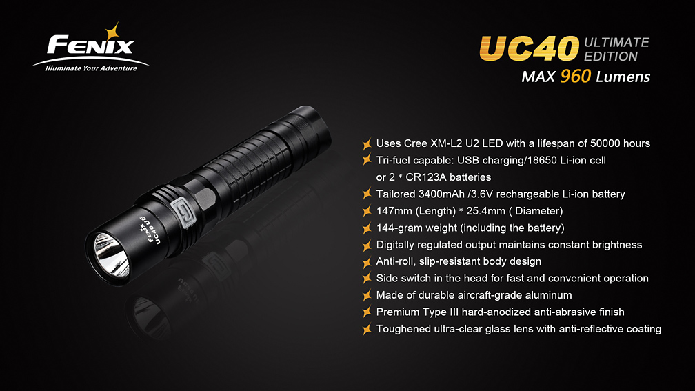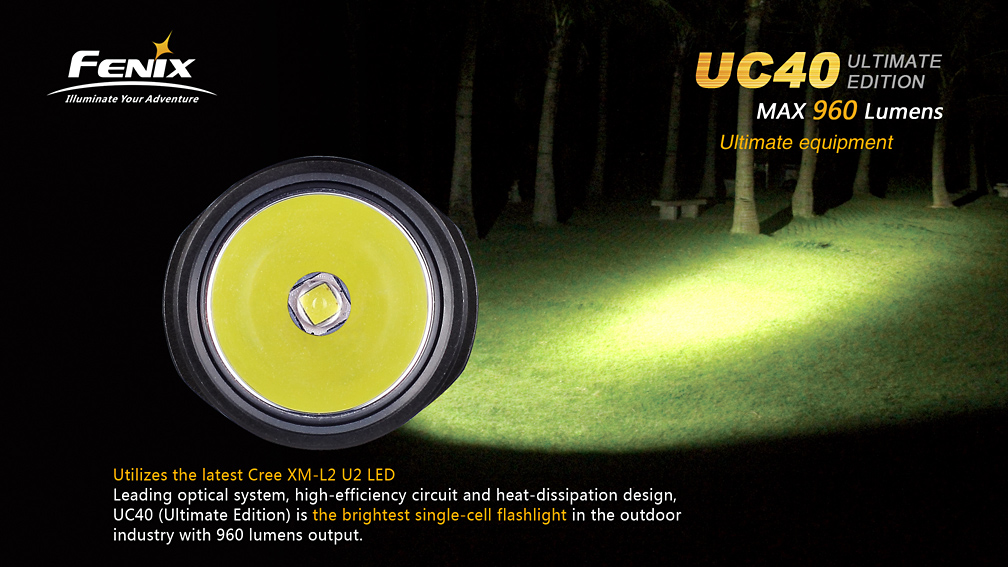 Extrémne výkonné nabíjacie svietidlo Fenix UC40 UE ponúka vysoký svetelný tok až 960 lúmenov (ANSI) a dosvit do vzdialenosti 204 metrov. Svetlo je osadené výkonnou LED Cree XM-L2 U2. Napájanie zaisťuje interná lítium-iontová batéria ARB-L1T s kapacitou 3400 mAh, ktorá sa nabíja priamo vo svietidle pomocou priloženého USB kábla. V prípade potreby však svetlo umožňuje napájanie i z jedného li-ion akumulátora typu 18650, alebo z dvoch jednorazových CR123A batérií. Iný než originálny akumulátor, ale nemožno vo svetle nabíjať. Ku svietidlu možno dokúpiť i náhradný akumulátor ARB-L1S s vlastným nabíjacím puzdrom.