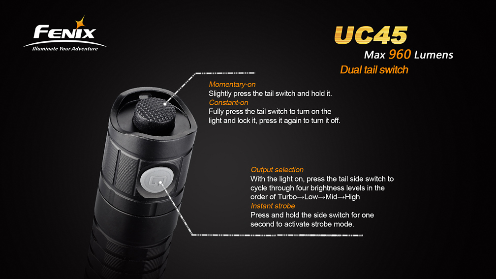 Fenix UC45 disponuje celkom piatimi režimami osvetlenia (vrátane stroboskopu) s výdržou až 135 hodín. Ovládanie sa realizuje druhým tlačidlom na boku svetla. UC45 výborne poslúži obzvlášť ako služobné svetlo pre políciu, hasičov, ostrahu a na ďalšie použitie, kde oceníte robustnú konštrukciu, jednoduché nabíjanie a veľmi vysoký výkon.