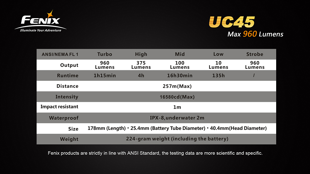 Všetky parametre baterky (svetelný tok, doba svietenia na batérie, vodotesnosť, dosvit a nárazuvzdornosť) sú merané v súlade s normou ANSI/NEMA FL 1-2009 Flashlight Basic Performance Standard.