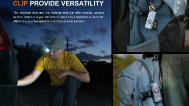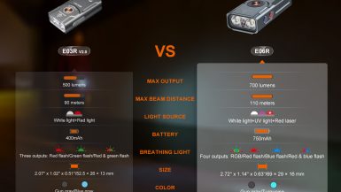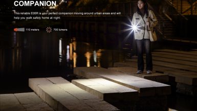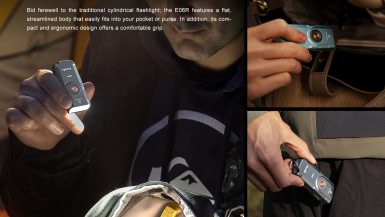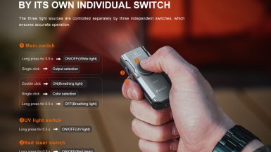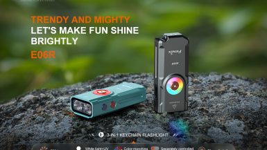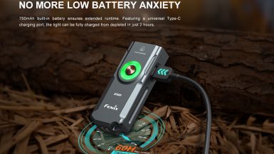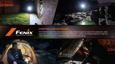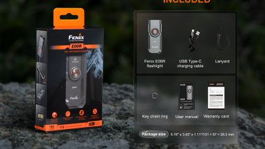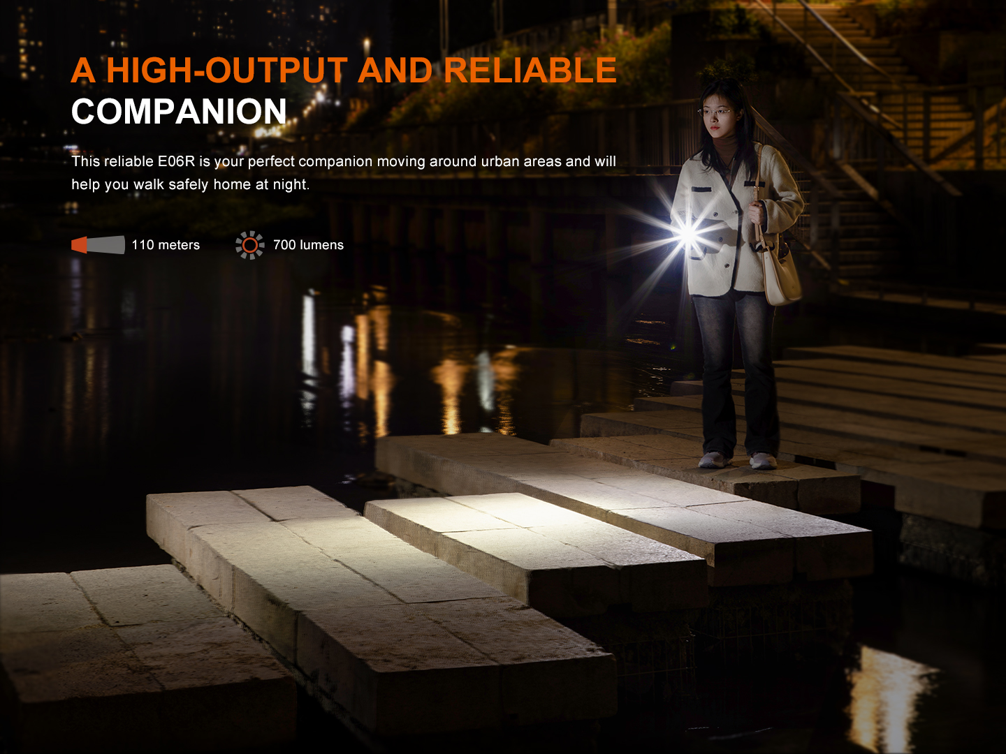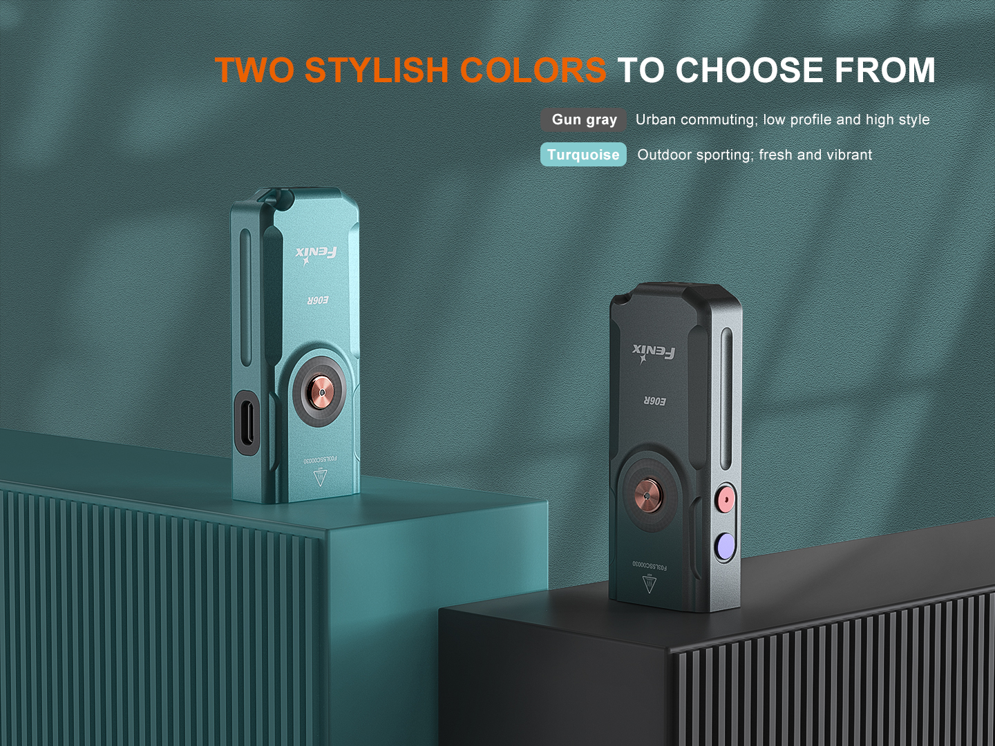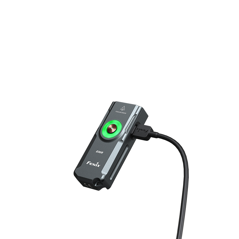 Fenix E06R je väčším variantom úspešnej miniatúrnej dobíjateľnej baterky Fenix E03R V2.0. Oproti nej má nielen vyšší výkon, ale aj ultrafialové svetlo a laserové ukazovadlo. Aj napriek kompaktným rozmerom a váhe iba 54 gramov ponúka vysoký svetelný tok až 700 lúmenov (ANSI). Svetelný kužeľ rovnomerne osvetľuje široký priestor až do vzdialenosti 110 metrov. Na napájanie slúži integrovaný akumulátor s kapacitou 750 mAh, ktorý sa nabíja cez moderný USB-C konektor na boku svietidla. K dispozícii sú celkom štyri režimy bieleho svetla, UV svetlo s vlnovou dĺžkou 365 nm o sile 580 mW, červený laser (ukazovadlo ≤0,39 mW) a niekoľko režimov tzv. Breathing light – svetlá okolo spínacieho tlačidla o sile 0,5 až 1 lúmen, ktoré využijete pre nenápadnú signalizáciu či identifikáciu umiestnenia svietidla. Svietidlo je dodávané vrátane pevného klipu, takže ho môžete uchytiť na vrecko, popruh batohu či šilt čiapky a uvoľniť tak pri svietení ruky. Vďaka magnetu v pätke svietidla ho môžete prichytiť na čokoľvek železné. Praktický je tiež indikátor stavu nabitia batérie v tlačidle. Táto vrecková baterka je skvelá pre EDC a vďaka malým rozmerom, plochému tvaru a váhe ju môžete mať stále pri sebe.