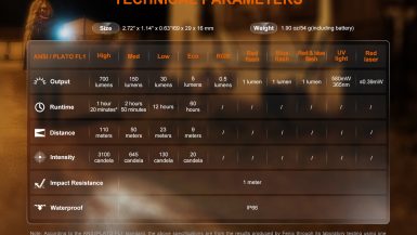 | ANSI / NEMA FL 1 | Vysoký | Stredný | Nízky | Eco | UV svetlo 365 nm | Červený laser | Dosvit | Intenzita | Nárazu- vzdornosť | Vodotesnosť | Dĺžka | Priemer | Reflektor | Hmotnosť |