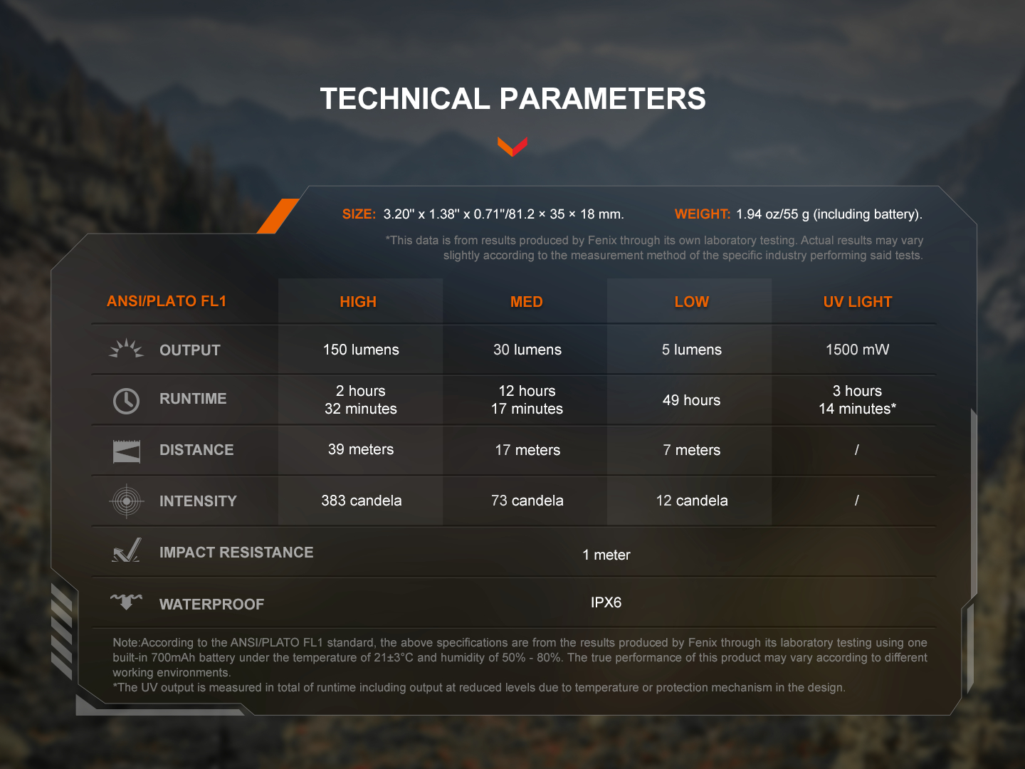 Všetky parametre svietidla (svetelný tok, doba prevádzky na batérie, vodotesnosť, nárazuvzdornosť a dosvit) sú zmerané v súlade s normou ANSI/NEMA FL 1-2009.