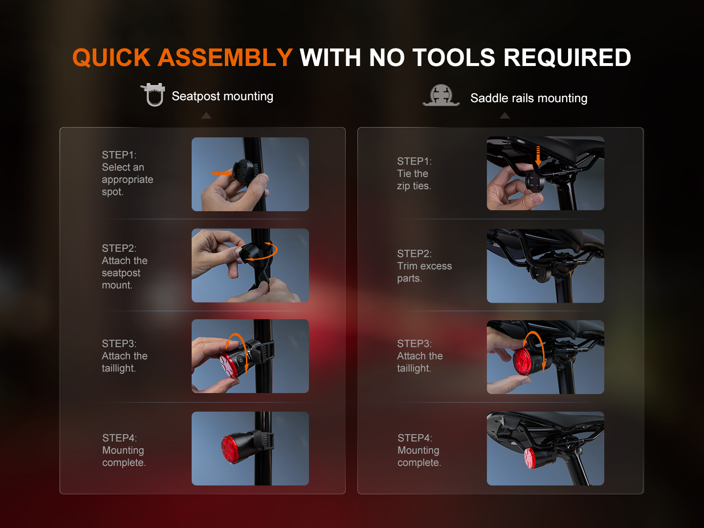 Dizajn uchytenia umožňuje rýchlu montáž aj demontáž svetla na bicykel bez použitia náradia. Objímka pasuje na sedlovú rúrku s priemerom 25,4 až 31,6 milimetra. Ďalej je v balení držiak, ktorým je možné blikačku uchytiť na podsedlové lyžiny (vzdialenosť lyžín musí byť medzi 39 a 50 milimetrami). V režime rýchleho blikania s výkonom 10 lúmenov dosahuje výdrž až 24,5 hodiny. Fenix BC06R vám zaistí bezpečné osvetlenie na nočné tréningy, pravidelné dochádzanie do práce aj na vytrvalostné závody.