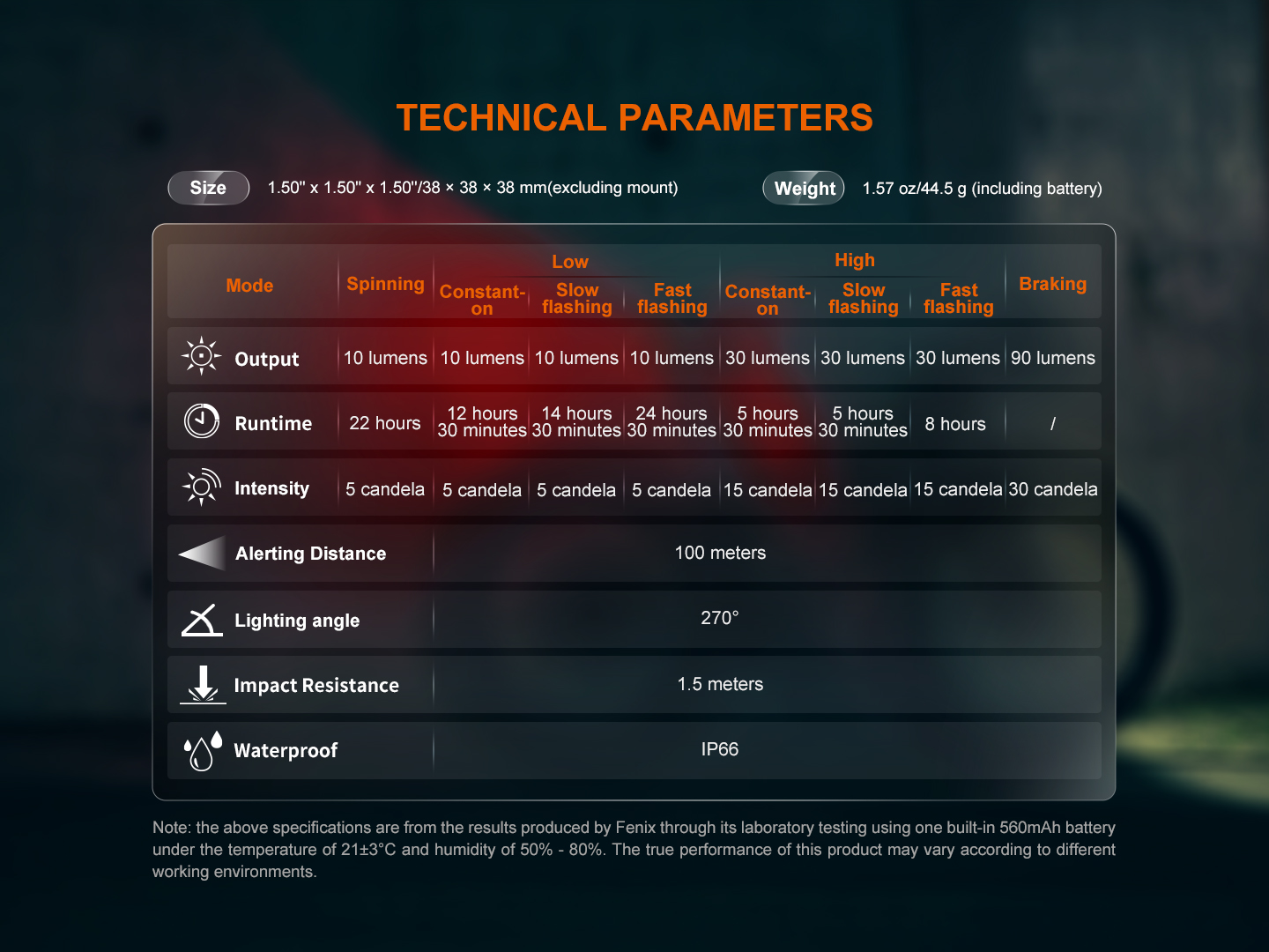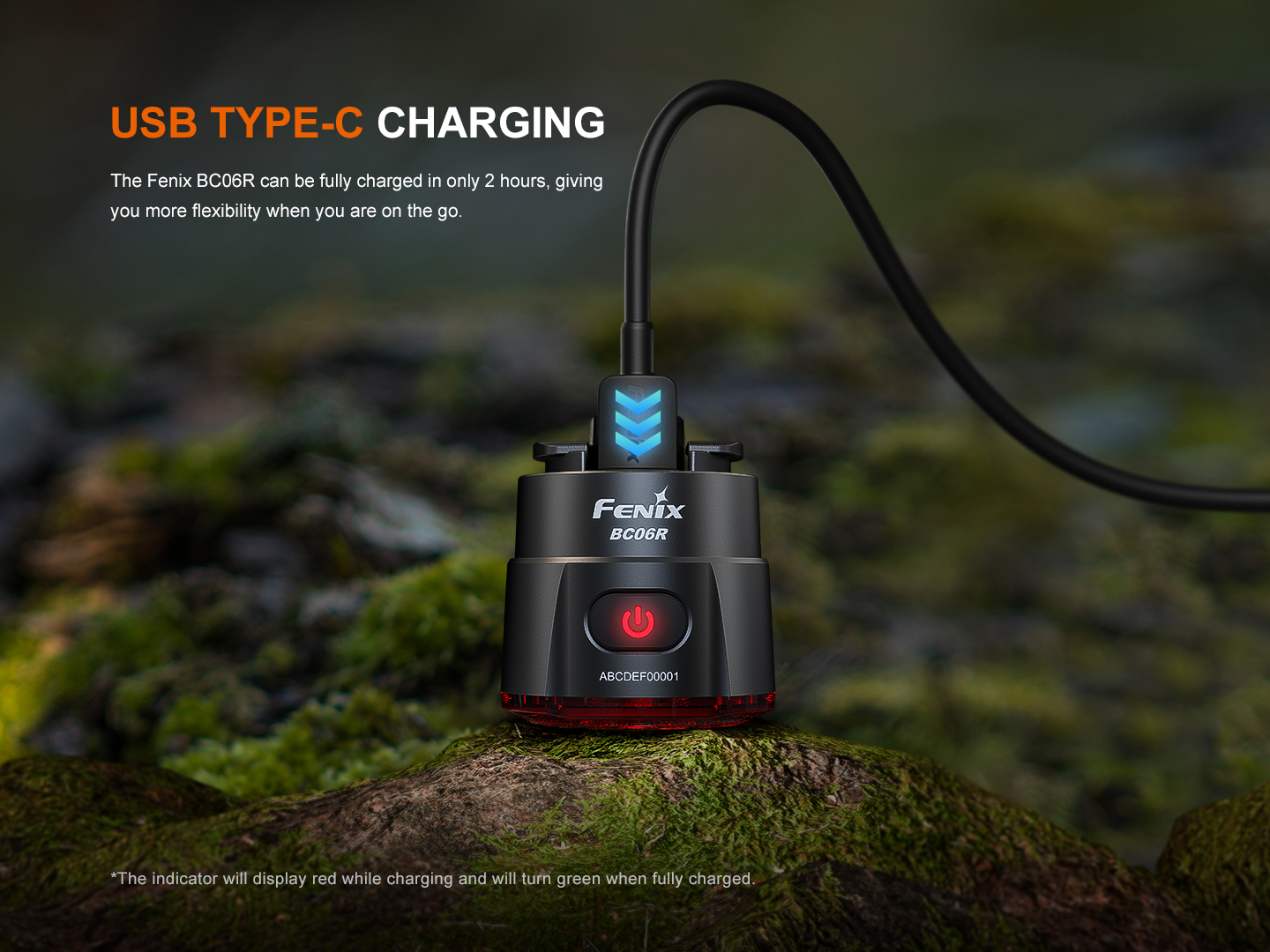 Nabíjateľná červená blikačka Fenix BC06R prináša dva stupne výkonu – 10 a 30 lúmenov plus režim brzdového svetla – 90 lúmenov. V oboch stupňoch výkonu má funkciu rýchleho blikania, pomalého blikania a konštantného svietenia, v nižšom stupni navyše ponúka rotujúce svietenie. Na napájanie slúži zabudovaný lítium-polymérový akumulátor s kapacitou 560 mAh, ktorý sa nabíja cez konektor typu USB-C priamo vo svietidle. Svetelným zdrojom sú červené LED, ktoré sú ukryté pod mierne vystúpenou optikou, ktorá vytvára široký svetelný kužeľ viditeľný až pod uhlom 270 stupňov. Účinná výstražná vzdialenosť blikačky dosahuje vzdialenosť 100 metrov. Hmotnosť svietidla je iba 44,5 gramu.