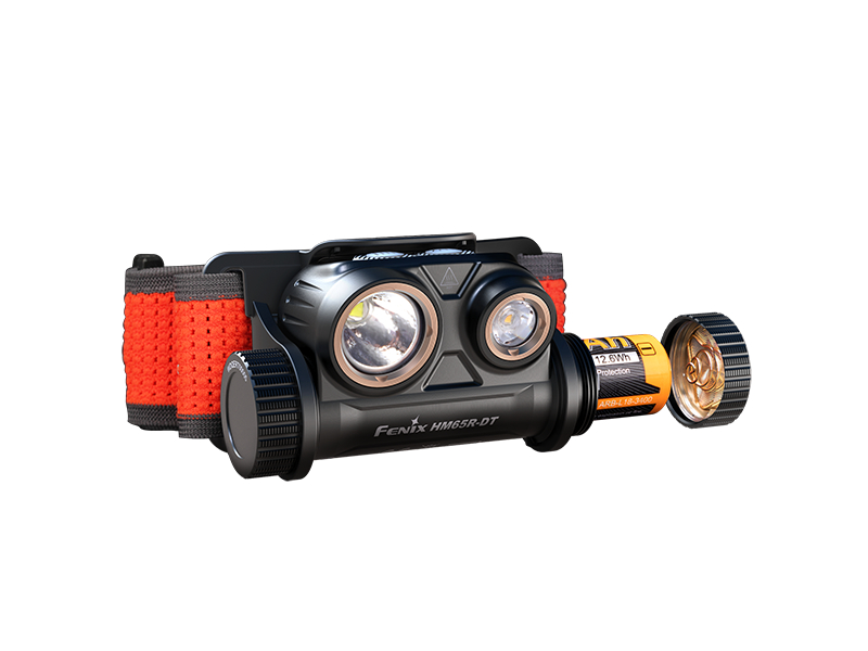 Nabíjateľná čelovka Fenix HM65R-DT sa vyznačuje konštrukciou z ľahkej magnéziovej zliatiny, vysokou odolnosťou voči vode i pádu, unikátnou konštrukciou s dvoma reflektormi a celkovým výkonom až 1500 lúmenov. Reflektory vytvárajú dobre zaostrené svetelné lúče. Jeden so studenejším bielym svetlom cca 6500K (tzv. denná biela) a druhý s teplým bielym svetlom cca 3000K. Svetelný tok hlavného reflektora je až 1300 lúmenov, druhý reflektor ponúka maximálny výkon 400 lúmenov. Ovládanie oboch LED je na sebe nezávislé, svetlo z oboch reflektorov je možné ľubovoľne kombinovať a dosiahnuť tak svetelný tok až 1500 lúmenov (pri zapnutí oboch reflektorov naraz je ich max. výkon 1150 + 350 lúmenov). Oba svetelné zdroje ponúkajú tri režimy svietenia. Na napájanie slúži jeden Li-ion akumulátor typu 18650 s kapacitou 3400 mAh, ktorý je súčasťou balenia a nabíja sa cez moderný USB-C konektor priamo v čelovke. V prípade núdze je možné čelovku napájať aj dvoma jednorazovými batériami CR123A.