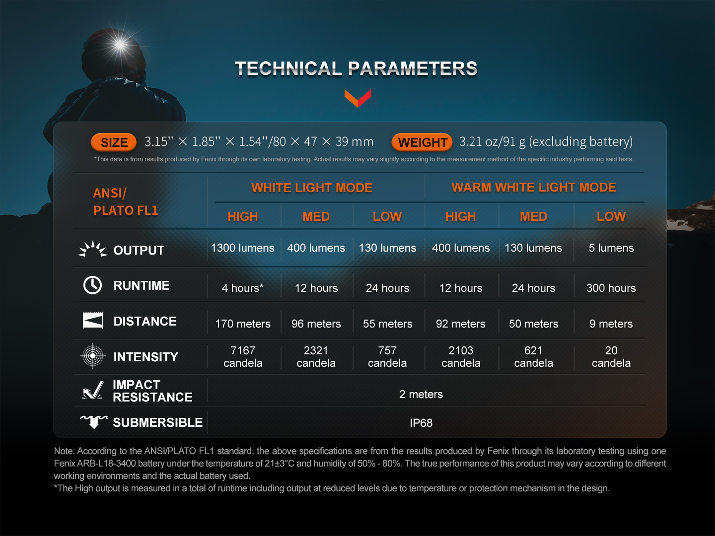 Všetky parametre čelovky (svetelný tok, doba prevádzky na batérie, vodotesnosť, dosvit a nárazuvzdornosť) sú zmerané v súlade s normou ANSI/NEMA FL 1-2009.