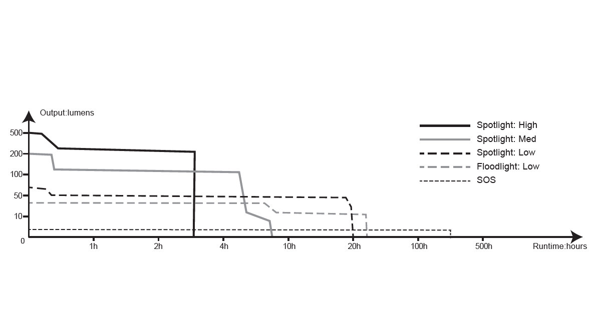 K dispozícii je celkom 5 režimov výkonu vrátane zábleskového režimu SOS pre krízové situácie. Čelovka je tiež vybavená inovovanou funkciou predĺženia výdrže. Pri dlhšom použití jednotlivých svetelných režimov čelovka postupne znižuje výkon v malých krokoch pre dosiahnutie dlhšej doby svietenia. Zníženie výkonu však nie je tak výrazné, ako u staršej čelovky HL18R.