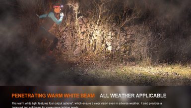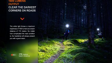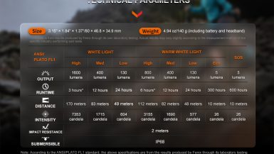 Hlavný reflektor ponúka 3 režimy svietenia, z ktorých maximálny svetelný tok je 1600 lúmenov, druhý reflektor ponúka maximálny výkon 800 lúmenov a zvoliť sa dá zo štyroch režimov svietenia. Čelovka disponuje aj SOS režimom a píšťalkou integrovanou na popruhu pre krízové situácie. Na napájanie slúži jeden Li-ion akumulátor typu 18650 s kapacitou 3400 mAh, ktorý je súčasťou balenia a nabíja sa cez moderný USB-C konektor priamo v čelovke. V prípade núdze je možné čelovku napájať aj dvoma jednorazovými batériami CR123A.