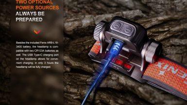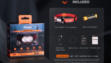 • Súčasťou balenia je Li-ion akumulátor Fenix 18650 3400 mAh, popruh na hlavu s integrovanou píšťalkou, nabíjací kábel USB-C, náhradný o-krúžok.