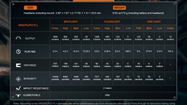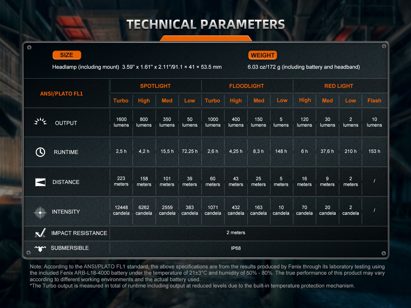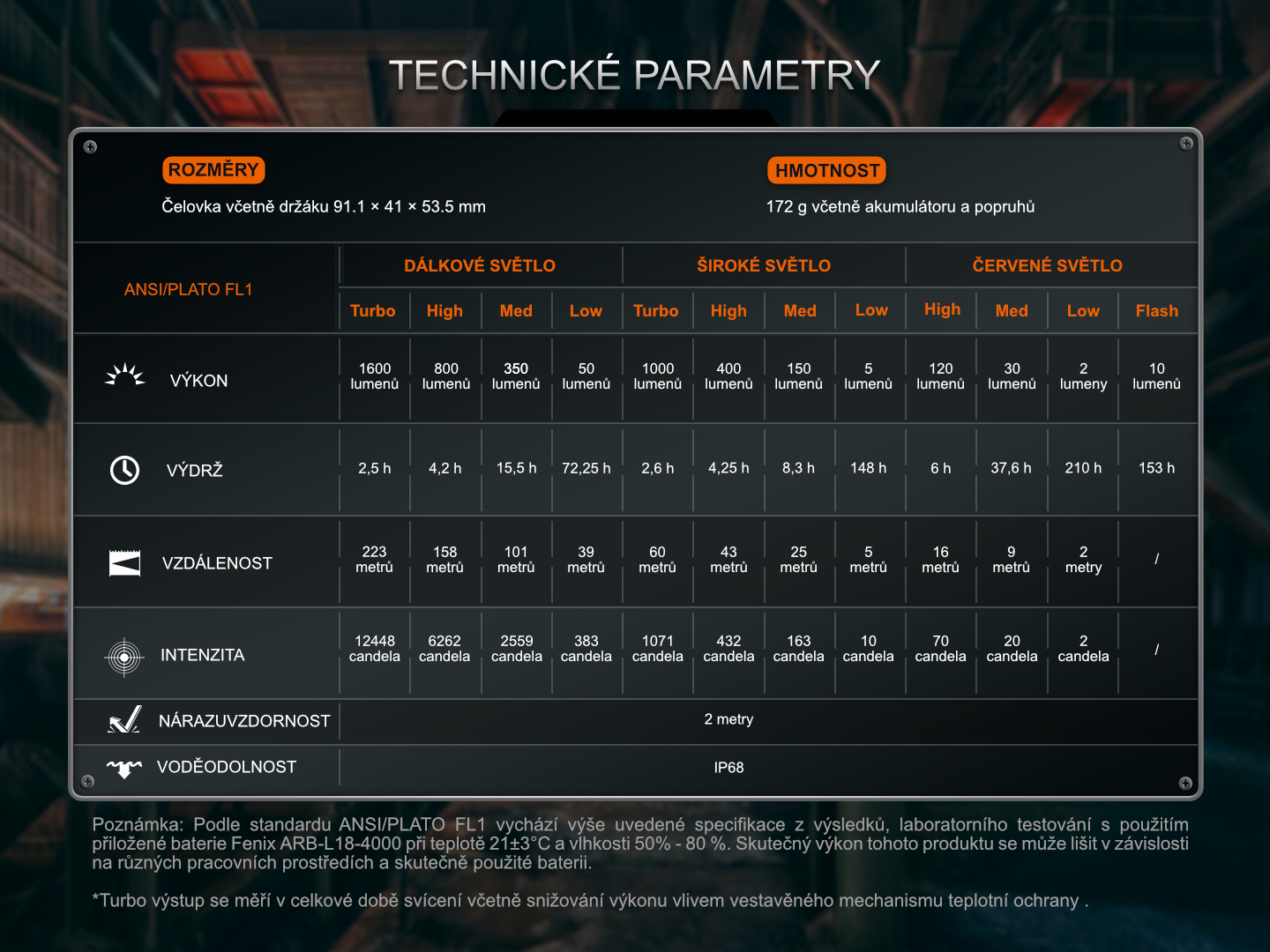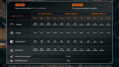 Všetky parametre čelovky (svetelný tok, doba prevádzky na batérie, vodotesnosť, dosvit a nárazuvzdornosť) sú zmerané v súlade s normou ANSI/NEMA FL 1-2009.