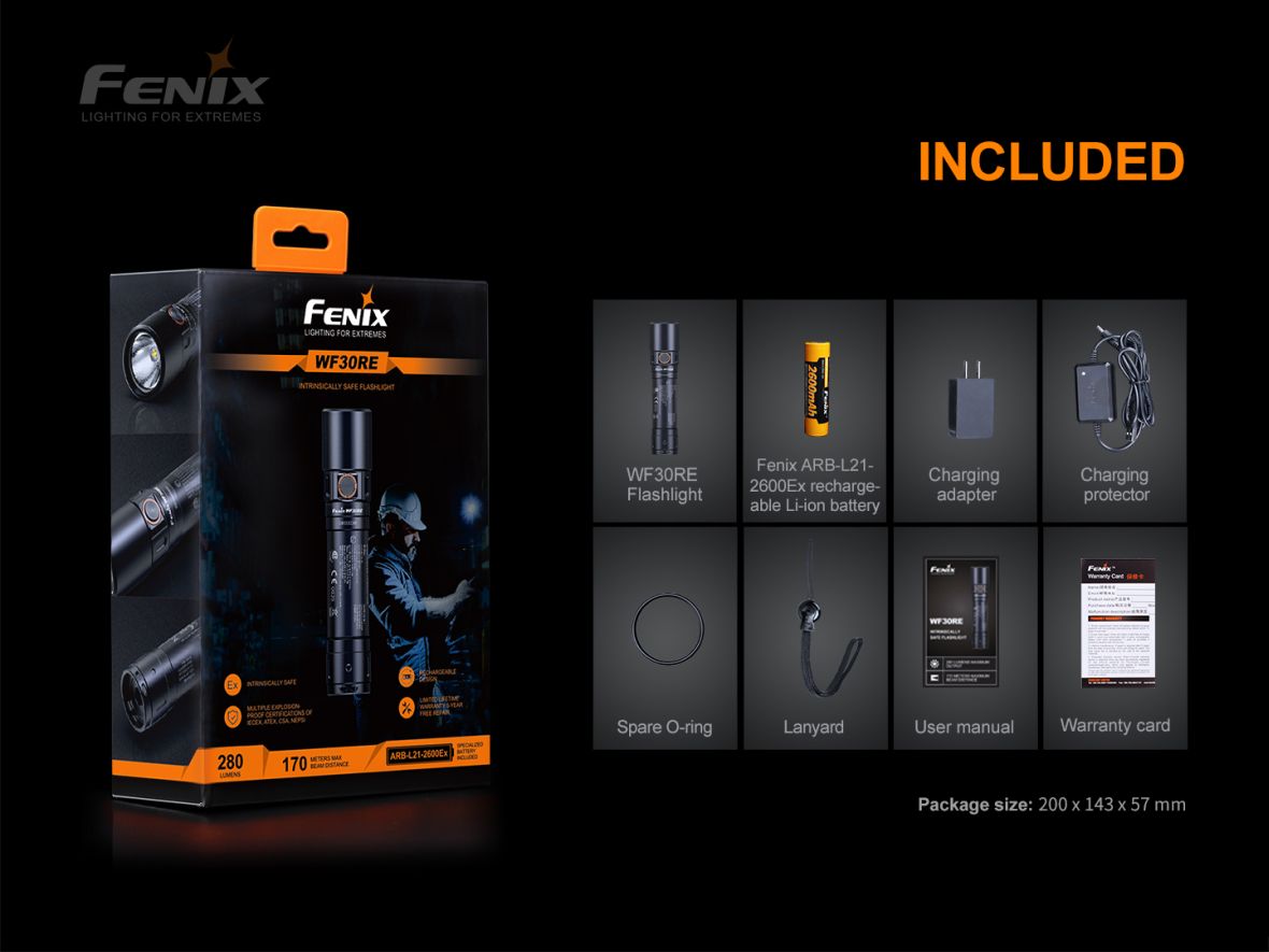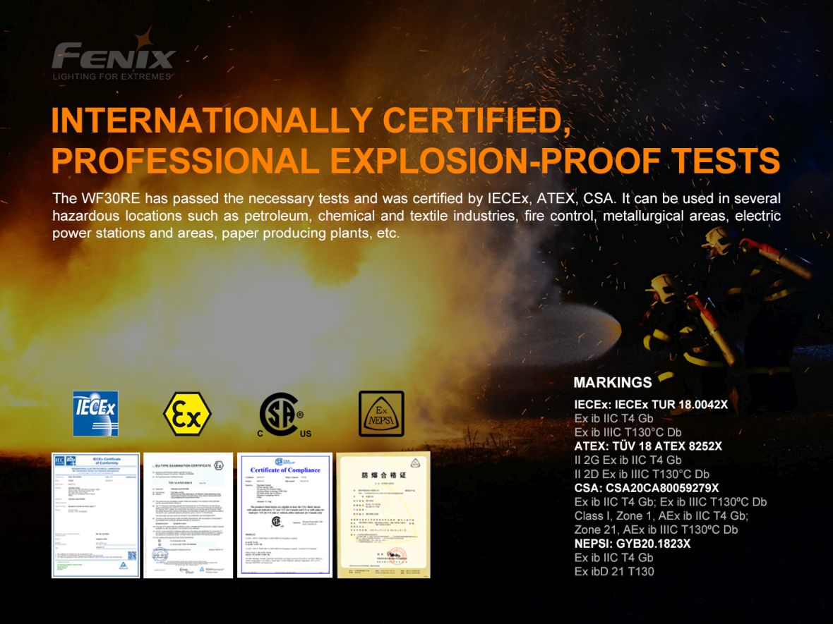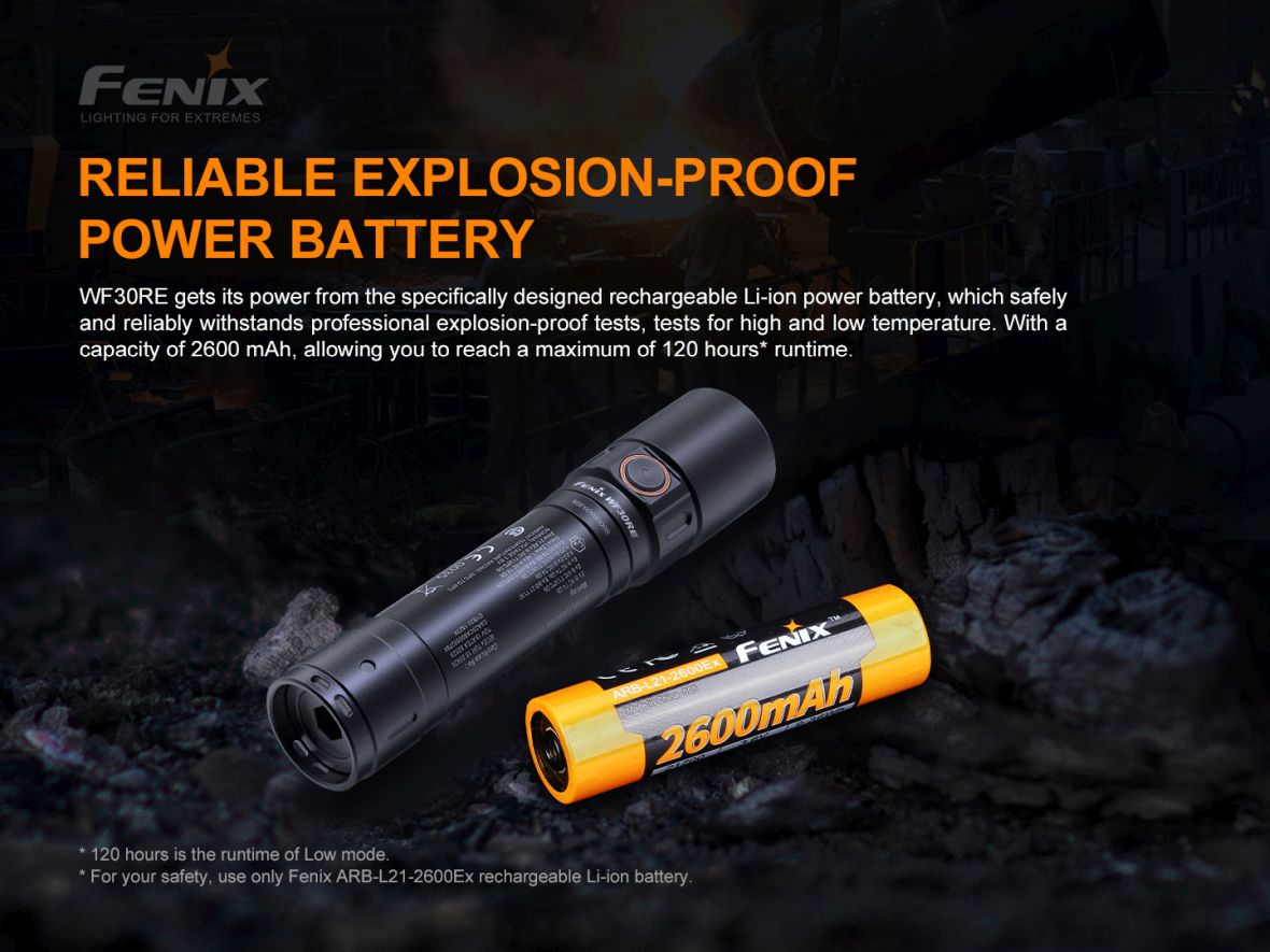 Profesionálne nabíjateľné svietidlo Fenix WF30RE s certifikáciou ATEX/IECex pre použitie vo výbušnom prostredí. Svietidlo je napájané špeciálne upraveným Li-ion akumulátorom ARB-L21-2600Ex s kapacitou 2600 mAh a poskytuje svetelný tok až 280 lúmenov s dosvitom 170 metrov. Akumulátor sa dobíja priamo vo svietidle za pomoci špeciálnej nabíjačky s bezpečnostnými obvodmi. Telo svietidla je vyrobené z leteckého hliníka s vysokou odolnosťou a nárazuvzdornosťou. Svietidlo je určené najmä pre hasičov a záchranárov, ďalej je vhodná ako pracovné svietidlo do priemyselných prevádzok s možnosťou výskytu výbušných prachov a plynov. Ide napríklad o chemické závody, rafinérie, textilky, papierne, mlyny, metalurgické prevádzky, elektrárne a ďalšie prevádzky.