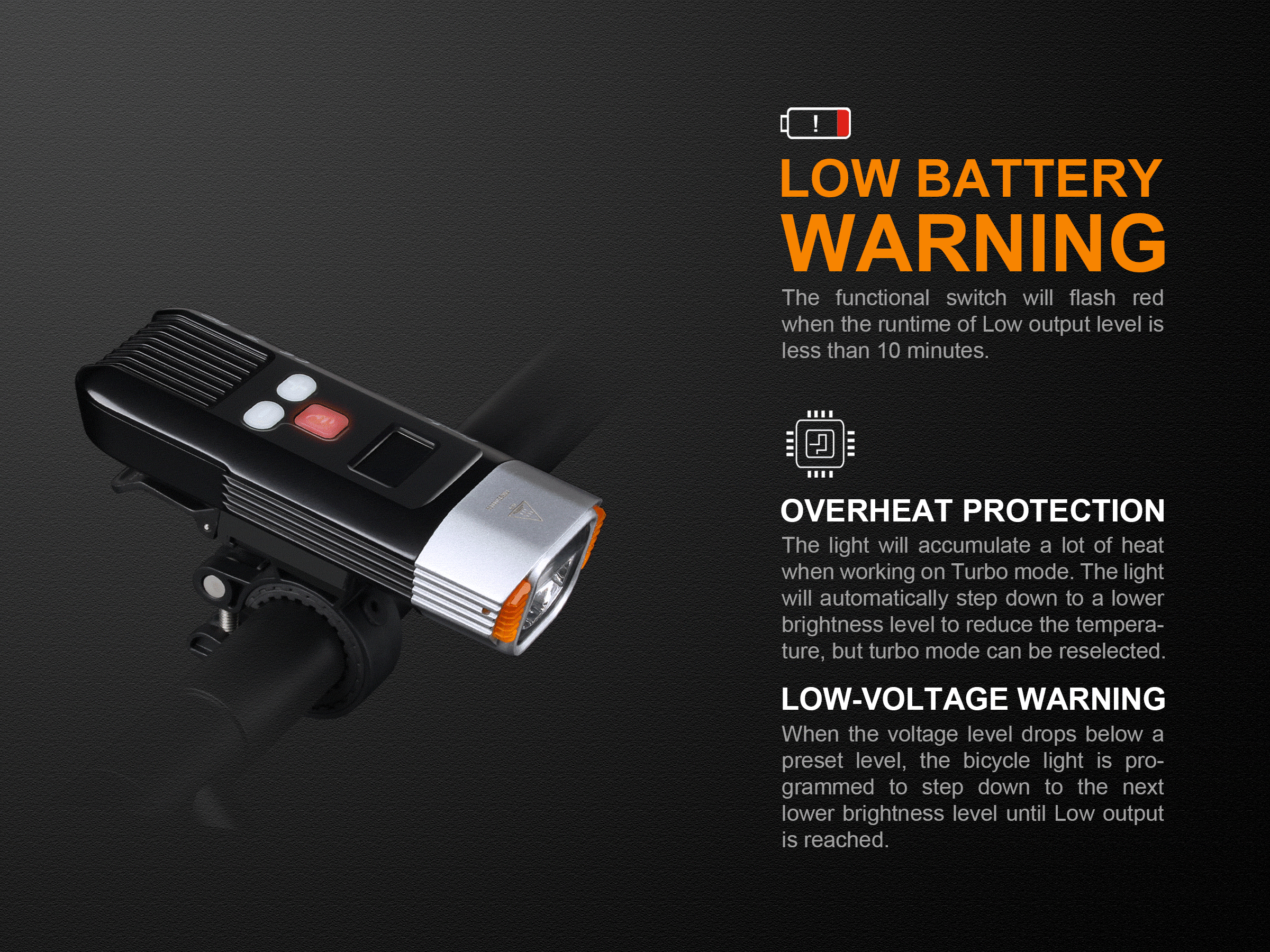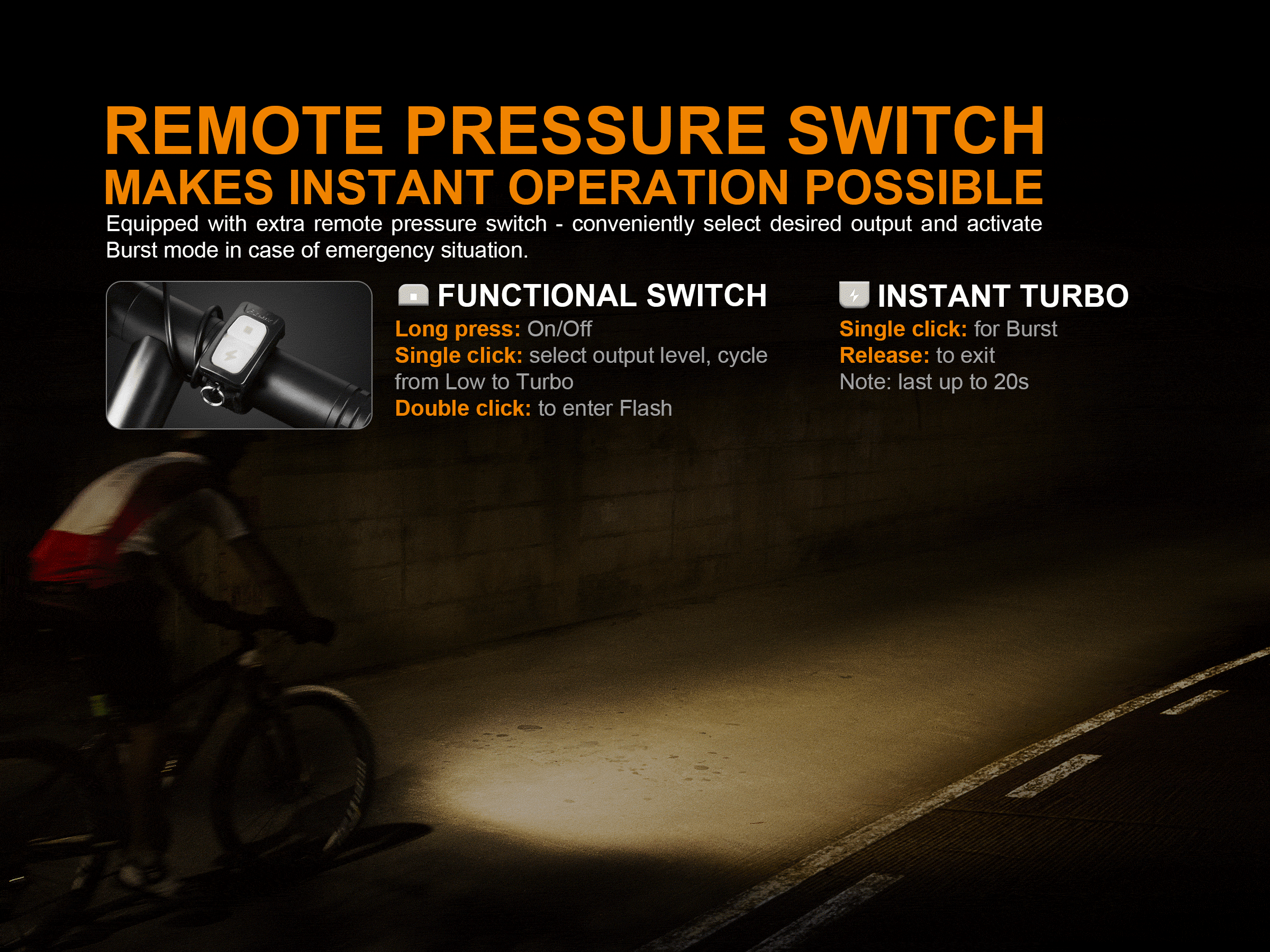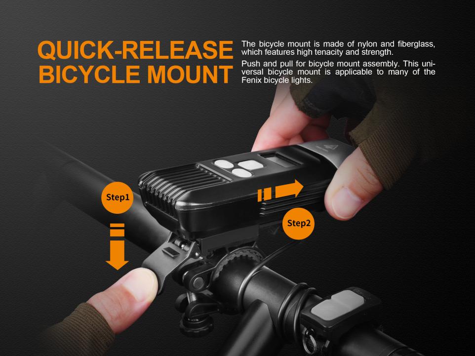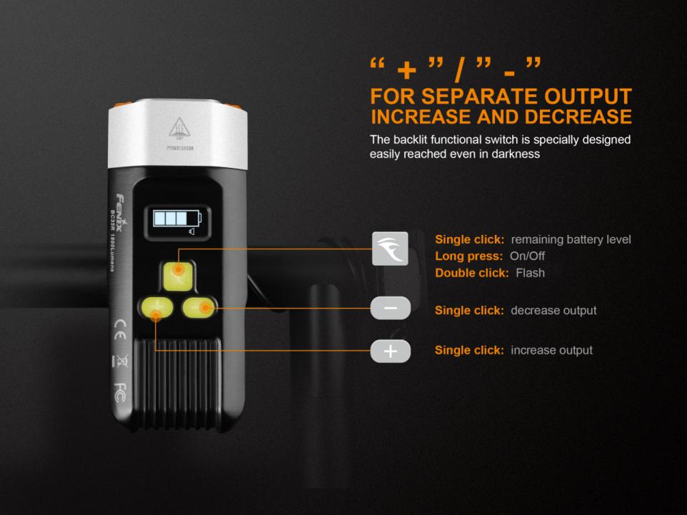 Káblovým spínačom možno svetlo zapnúť, vypnúť aj prepínať medzi režimami výkonu. Nový dizajn držiaku na riadidlá sa vyznačuje nižšou hmotnosťou a rýchlejšou montážou bez použitia náradia. Držiak umožňuje rýchle vybratie svietidla, takže ho možno použiť aj ako vysoko výkonné ručné svetlo. Držiak možno použiť na všetky riadidlá s priemerom od 22 až do 32 milimetrov. Naviac svietidlo obsahuje aj poplašné zariadenie proti odcudzeniu.