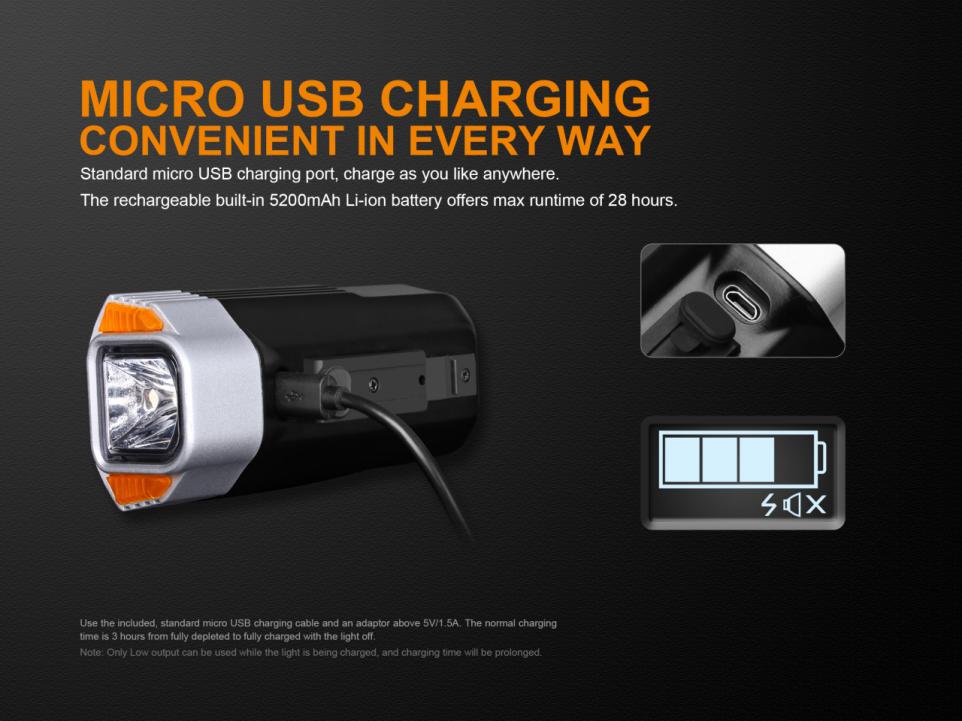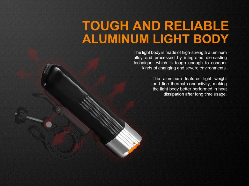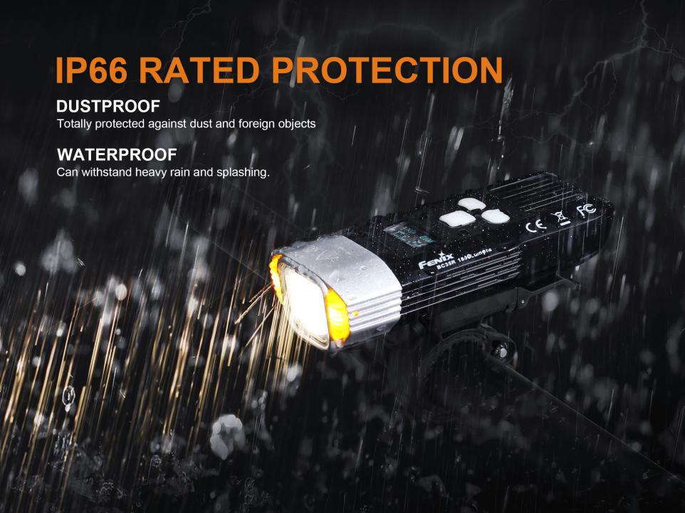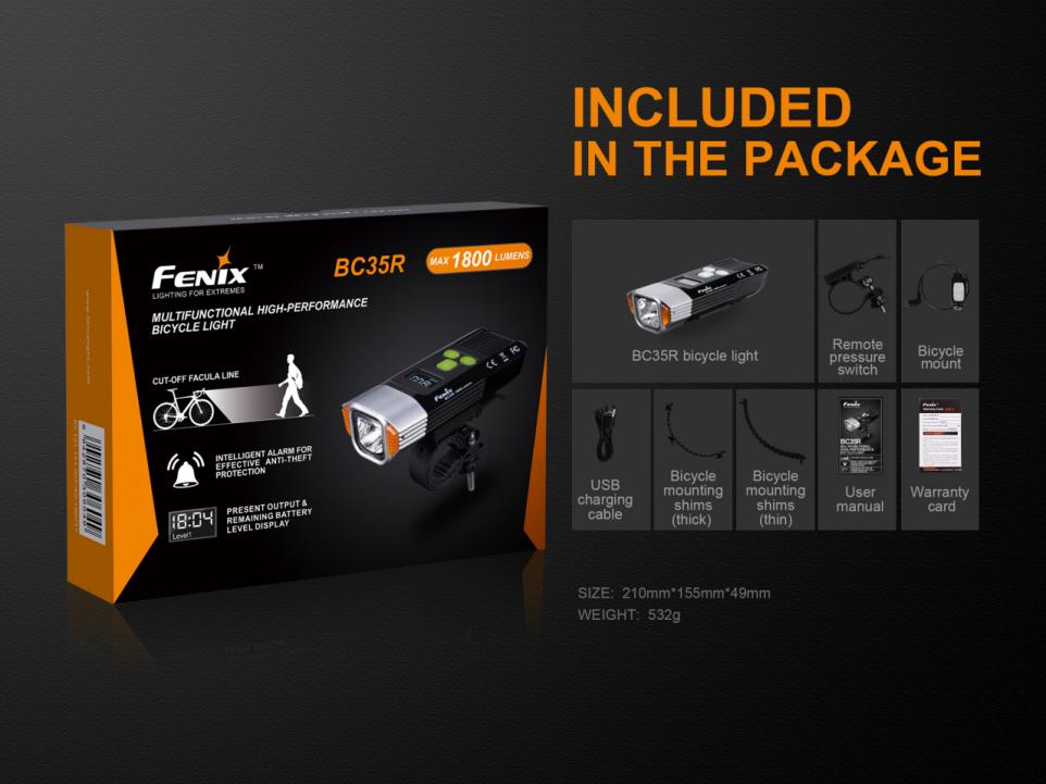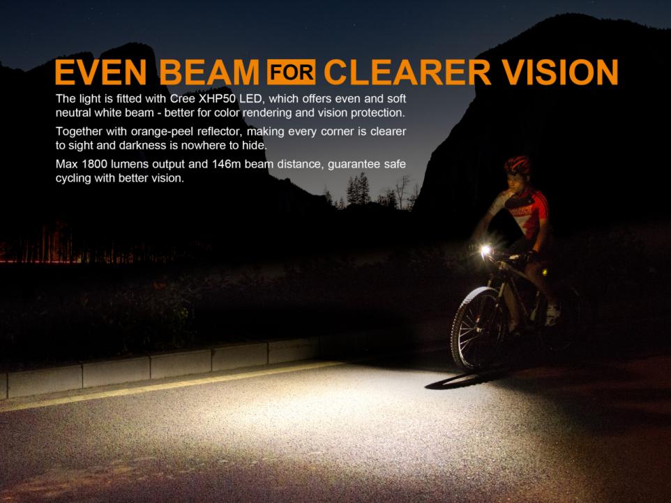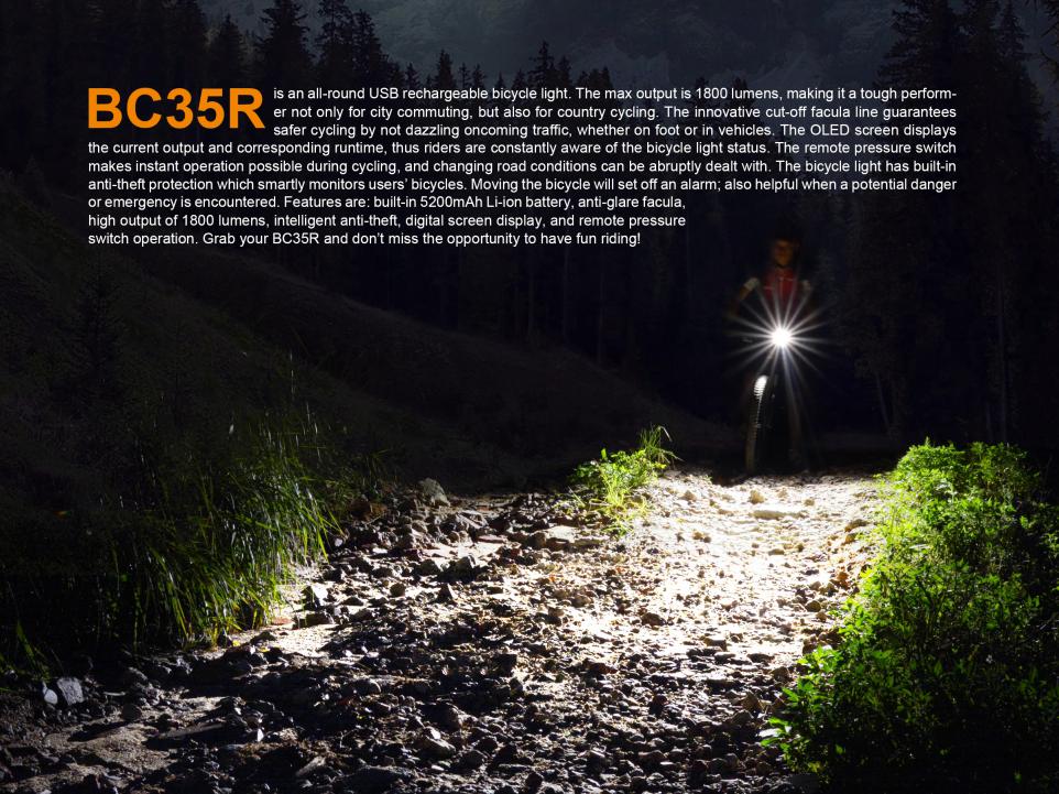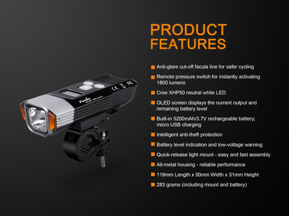 Nabíjateľné cyklosvetlo Fenix BC35R prináša svetelný tok až 1800 lúmenov (ANSI) a dosvit až 146 metrov. Na napájanie slúži interný Li-ion akumulátor s kapacitou 5200 mAh / 3,7V, ktorý sa nabíja cez micro USB konektor priamo vo svietidle. Svetelným zdrojom je moderná LED Cree XHP50 s teplejším odtieňom svetla (neutral white). Výhodou tohto odtieňa svetla je prirodzenejšie a kontrastnejšie podanie farieb v teréne. Svietidlo používa špeciálne tvarovaný reflektor, ktorý smeruje svetlo iba dopredu a do strán, nie hore. Svetelný kužeľ je teda zhora ostro zrezaný a vďaka tomu neoslňuje ostatných vodičov a chodcov. Svetlo na bicykel Fenix BC35R je preto obzvlášť vhodné pre použitie na cestách a cyklotrasách.