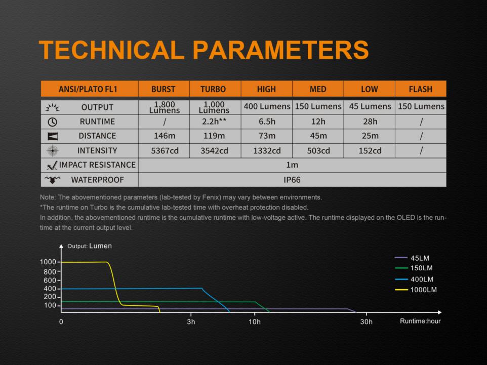 Všetky parametre baterky (svetelný tok, doba svietenia na batérie, vodotesnosť, dosvit a nárazuvzdornosť) sú merané v súlade s normou ANSI/NEMA FL 1-2009 Flashlight Basic Performance Standard.
