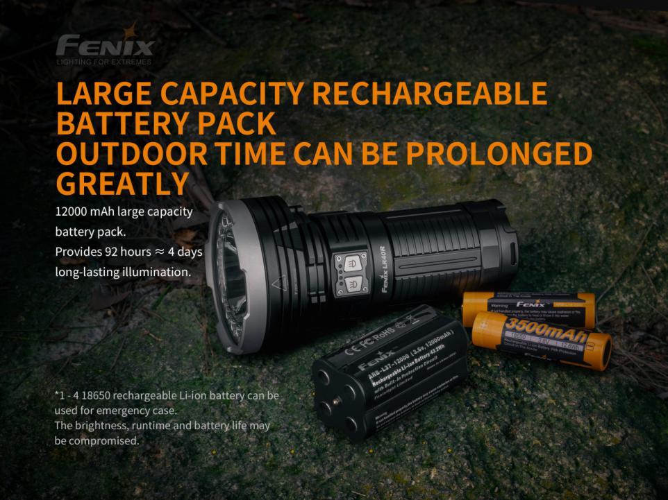 Ultra výkonné nabíjateľné svietidlo Fenix LR40R prináša extrémny svetelný tok až 12000 lúmenov (ANSI) a dosvit až 773 metrov. Svoj výkon dosahuje pomocou jednej výkonnej LED Cree XP-L HI a osemnástich LED Cree XP-G3, ktoré sú napájané z interného vysokoprúdového Li-ion akumulátora s kapacitou 43,2 Wh. Akumulátor sa dobíja priamo vo svietidle cez moderný USB-C konektor. Svietidlo ponúka ovládanie pomocou dvoch tlačidiel, ktorými sa samostatne ovláda široký (11000 lúmenov) a diaľkový (1000 lúmenov) kužel svetla, pričom oba reflekory je možné aktivovať aj naraz. Navyše je k dispozícii aj stroboskop a režim SOS pre núdzové situácie.