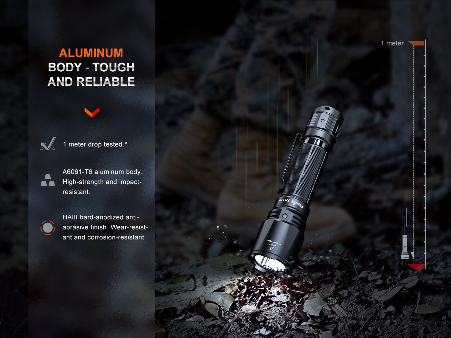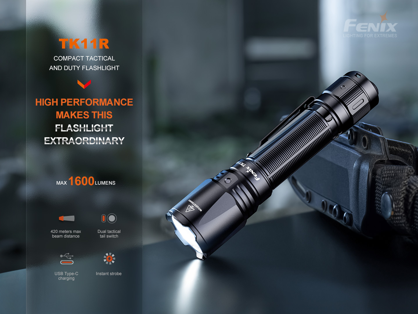 Fenix TK11R je nabíjateľné taktické svietidlo s jednoduchým ovládaním s možnosťou rýchlej aktivácie stroboskopu a výkonom až 1600 lúmenov. Je osadené špičkovou LED Luminus SFT-40, vďaka ktorej dosvieti až do vzdialenosti 420 metrov. Svietidlo používa duálny taktický spínač, ktorý umožňuje rýchlejšie a spoľahlivejšie ovládanie v krízových situáciách. Hlava svietidla je vybavená úderným ráfikom, takže ho možno použiť na prerazenie skla či na sebaobranu. Robustné prevedenie umožňuje použitie svietidla na dlhých zbraniach, je tak vhodné pre profesionálov, ozbrojené zložky i poľovníctvo. Svietidlo je napájané z jedného vysokokapacitného Li-ion 18650 3400 mAh akumulátora (je súčasťou balenia), ktorý sa nabíja priamo vo svietidle cez moderný USB-C konektor a dodá energiu až pre 25,5 hodiny svietenia, alebo núdzovo z dvoch jednorazových CR123A batérií. Solídny a vodeodolný dizajn predurčuje toto taktické svietidlo primárne do drsných vonkajších podmienok a na použitie v bezpečnostných zložkách, pri vyhľadávaní, záchranných akciách a na poľovníctvo