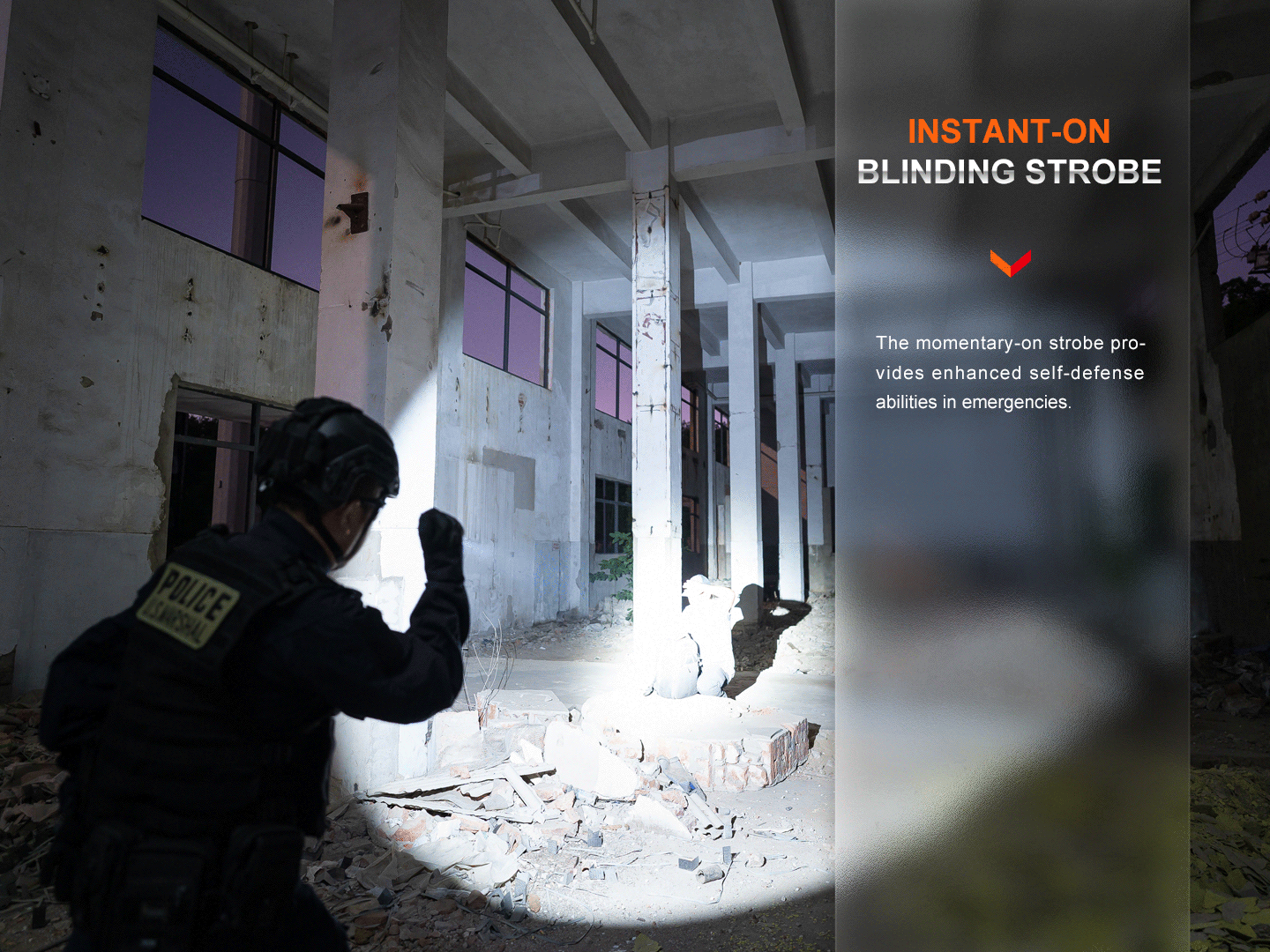 - Duálny taktický vypínač na konci svietidla (funkcia okamžitého zapnutia/vypnutia pridržaním, instantný stroboskop).