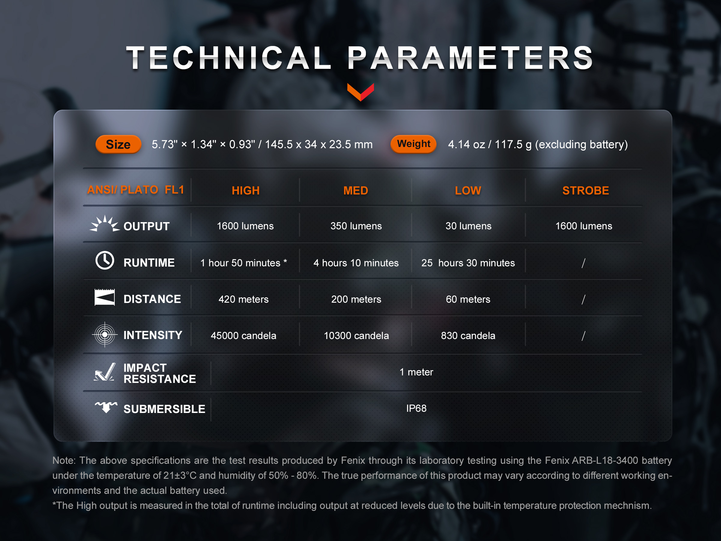 Všetky parametre svietidla (svetelný tok, doba prevádzky na batérie, vodotesnosť, dosvit a nárazuvzdornosť) sú zmerané v súlade s normou ANSI/NEMA FL 1-2009.