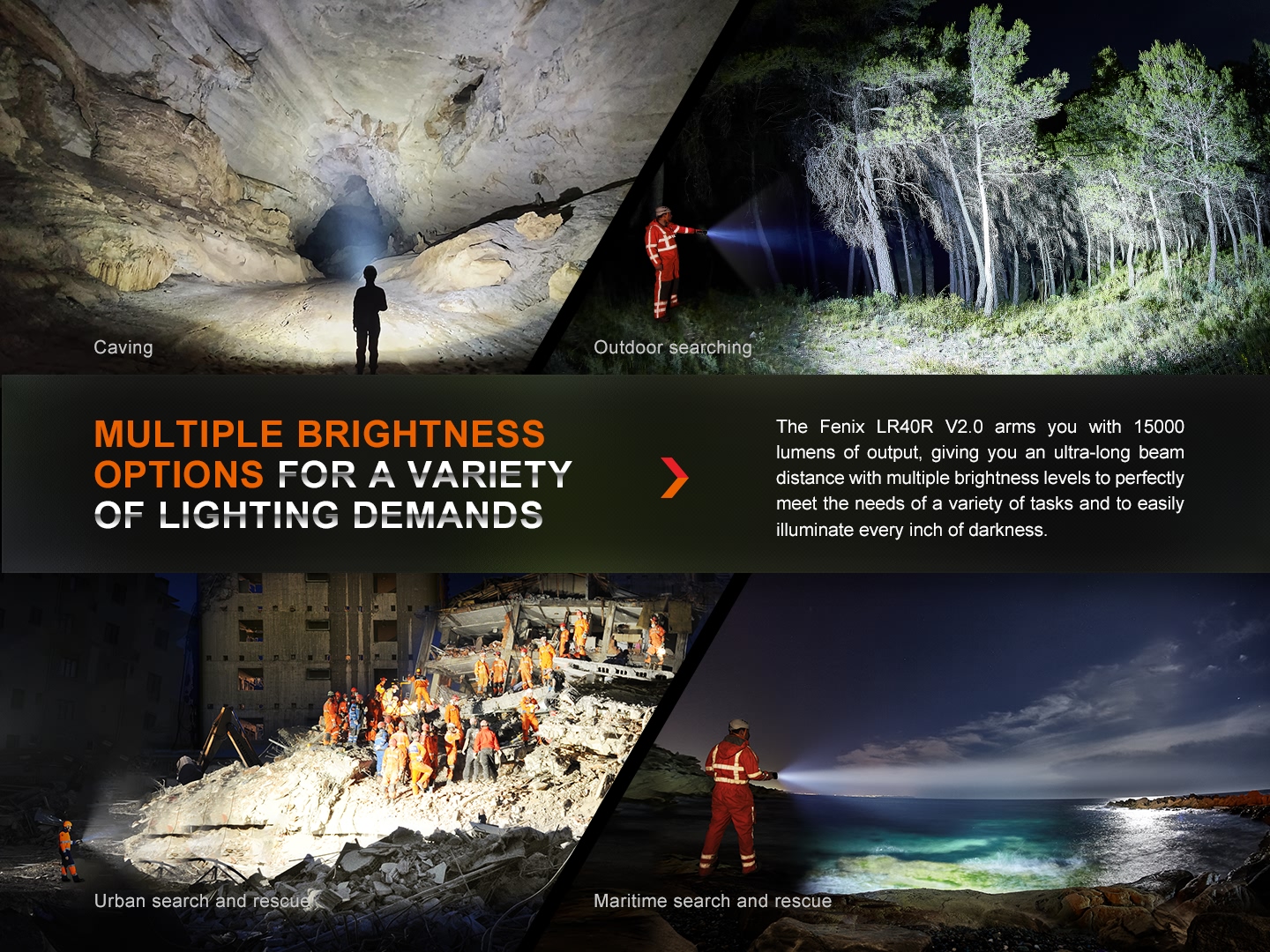 Ultra výkonné dobíjateľné svietidlo Fenix LR40R V2.0 prináša extrémny svetelný tok až 15000 lúmenov (ANSI) a dosvit až 900 metrov. Tento výkonu dosahuje pomocou jednej prémiovej LED Luminus SFT-70 a šestnástich LED Lumileds HL2X, ktoré sú napájané z interného vysokoprúdového Li-ion akumulátora s kapacitou 54 Wh (5000 mAh /10,8 V). Akumulátor sa dobíja priamo vo svietidle cez moderný USB-C konektor. Svietidlo sa ovláda otočným voličom, ktorým je možné vyberať medzi svietením širokým kužeľom (až 12000 lm) a diaľkovým reflektorom (až 3000 lm), prípadne oboma súčasne (15000 lm dohromady). Navyše je k dispozícii stroboskop a SOS pre núdzové situácie.