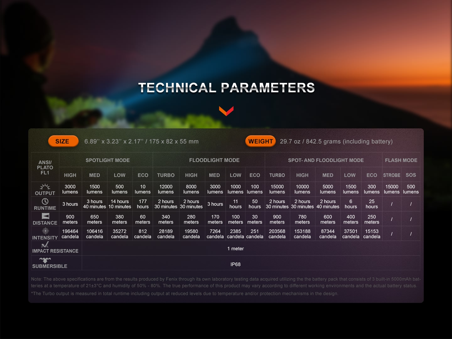 | Výkon (lúmeny) | 15 000 | 10 000 | 5 000 | 1 500 | 300 | 15 000 | 500 | 900 m | 203 568 cd | 1 m | IP68, 2 m pod vodou | 175 mm | 55 mm | 82 mm | 843 g (vrátane batérií) |