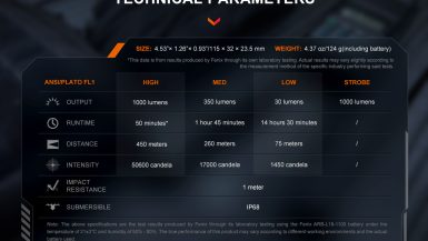 Všetky parametre svietidla (svetelný tok, doba prevádzky na batérie, vodotesnosť, dosvit a nárazuvzdornosť) sú zmerané v súlade s normou ANSI/NEMA FL 1-2009.