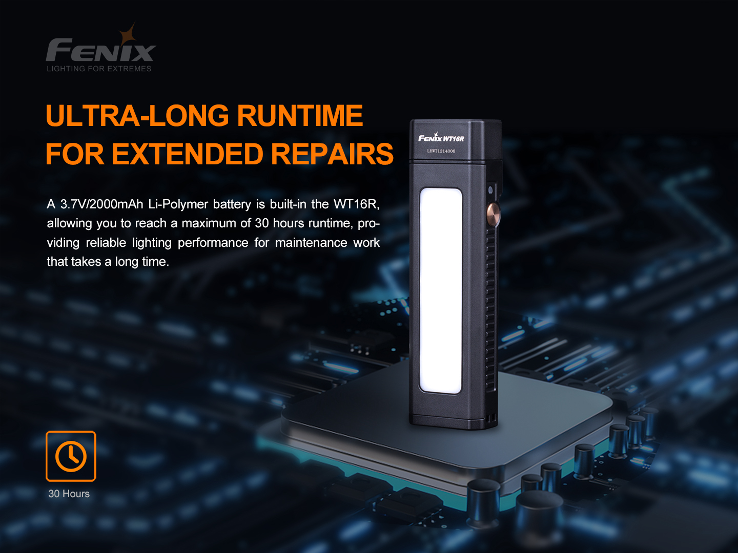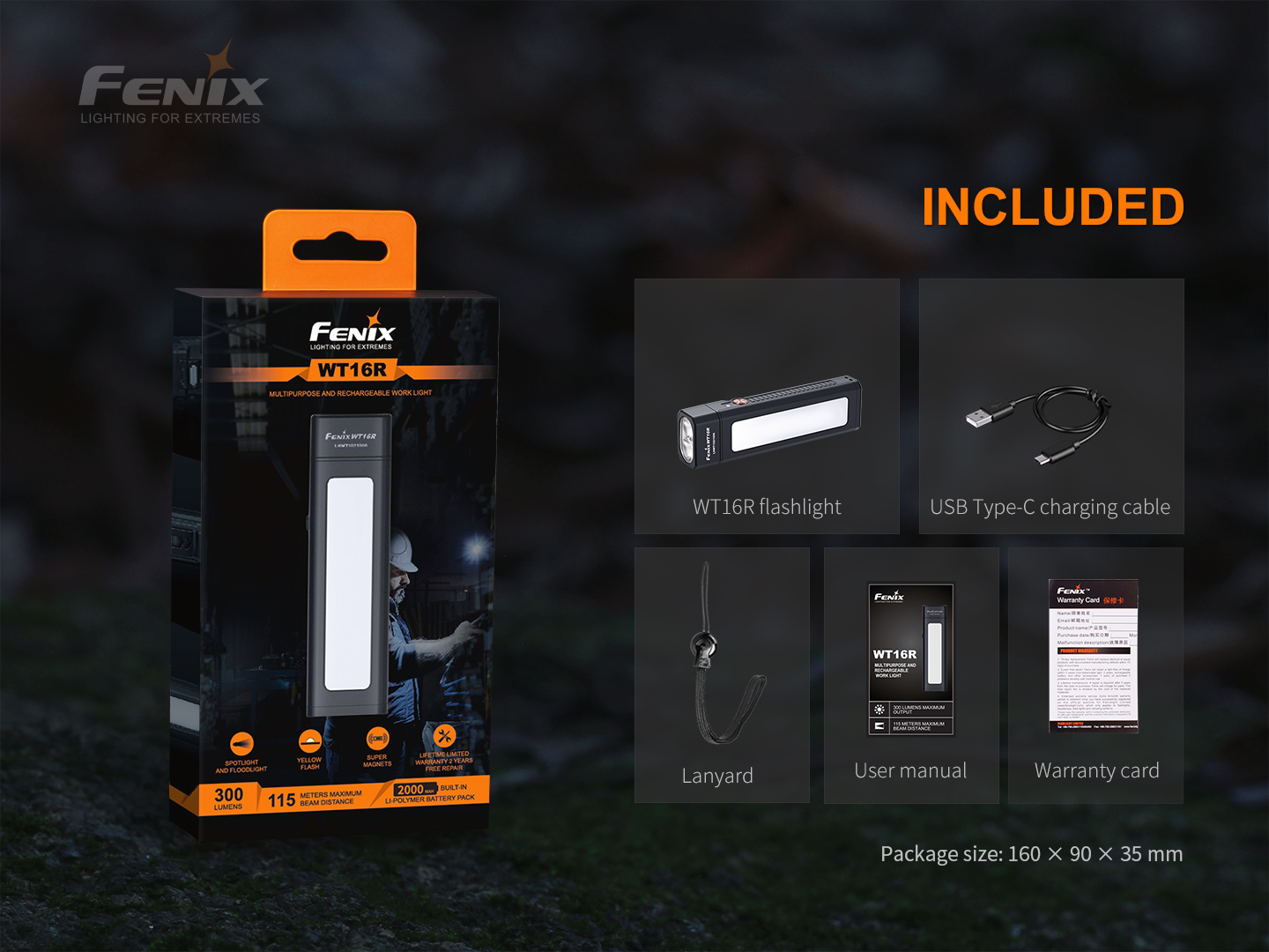 Nabíjateľné svietidlo Fenix WT16R je viacúčelové s diaľkovým reflektorom a bočným širokým svetlom, oboje s výkonom až 300 lúmenov. Svetelným zdrojom v diaľkovom reflektore je dvojica LED Cree XP-E2, bočné svetlo obsahuje niekoľko COB LED. Toto bočné svetlo má široký svetelný kužeľ s rovnomernou intenzitou, ktorý je ideálny nielen pre osvetlenie pracoviska, navyše má aj funkciu výstražného žltého blikania. Svietidlo Fenix WT16R je tiež vybavené pevnou oceľovou sponou pre jednoduché nosenie na opasku či vrecku. Ďalej je vybavené dvoma silnými magnetmi, jeden je umiestnený na boku a druhý na spodnej strane. Svietidlo je tak možné ľahko uchytiť na železný povrch v dvoch rôznych polohách. Svojou variabilitou je svietidlo navrhnuté špeciálne pre pracovné využitie, ale skvele poslúži v domácnosti i pri kempovaní.