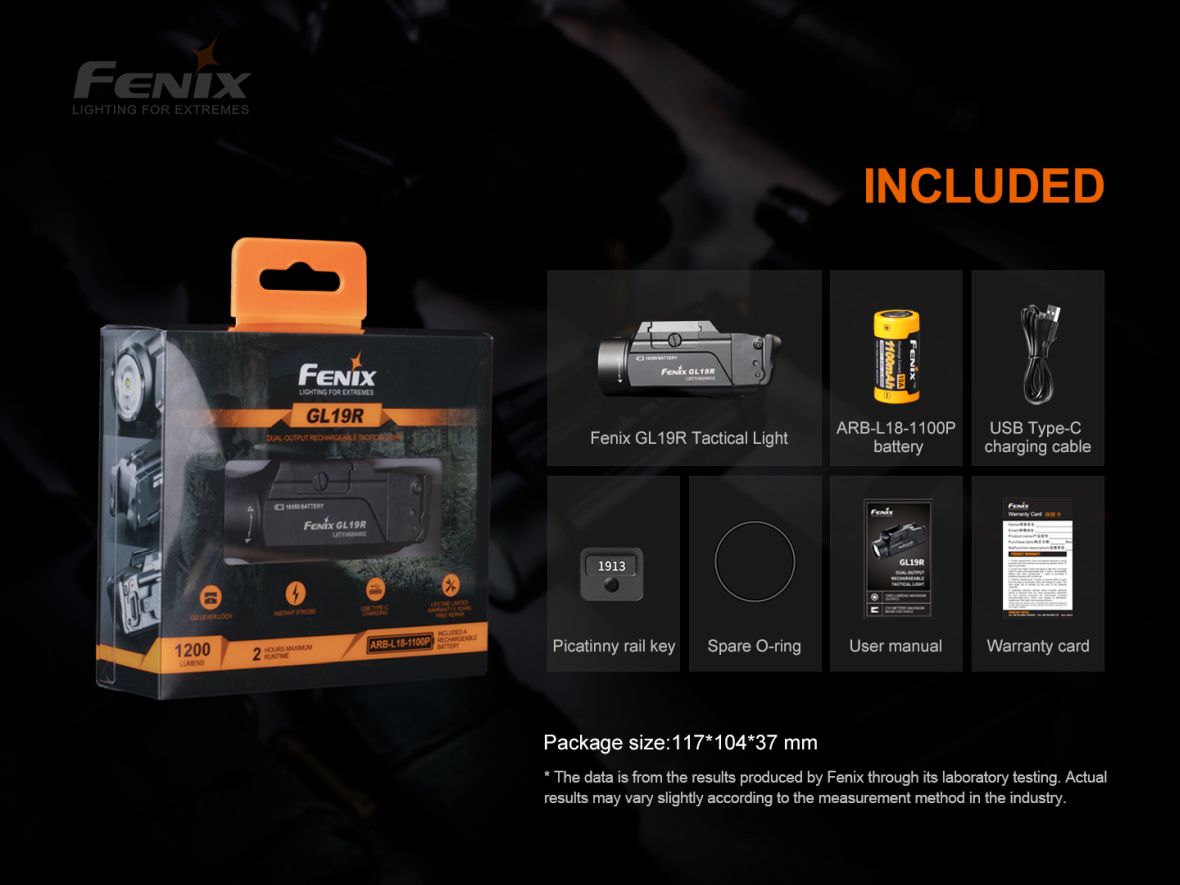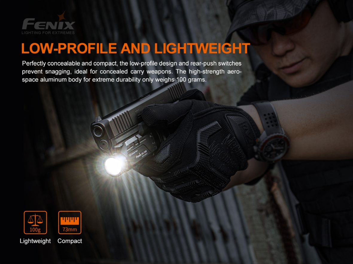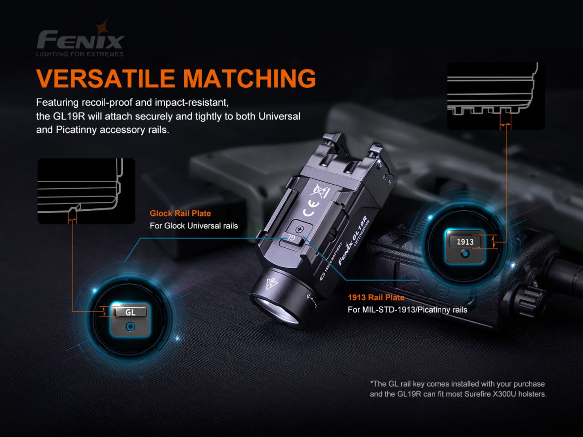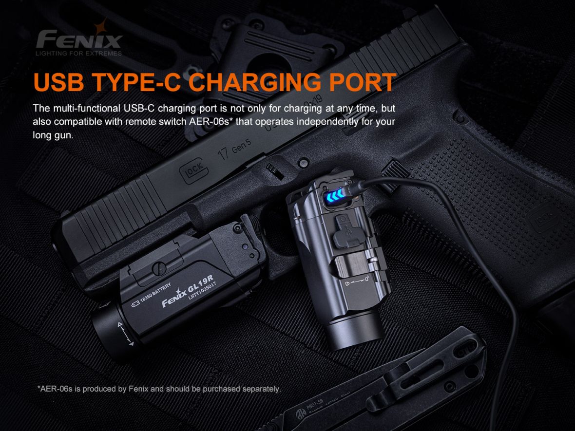 Nabíjateľné pištoľové LED svietidlo Fenix GL19R je skonštruované špeciálne pre použitie na krátkych zbraniach a v kombinácii s dialkovým spínačom AER-06S je možné ju použiť aj na zbrani dlhej vybavenej lištou štandardu Picatinny MIL-STD-1913. Ponúka špičkový výkon svetla 1200 ANSI lúmenov s dosvitom až 210 metrov. Svietidlo je napájané jedným Li-ion akumulátorom Fenix ARB-L18-1100P (veľkosť 18350), ktorý sa nabíja cez USB-C konektor priamo vo svietidle. Zjednodušené ovládanie svietidla je obojstranné (pre pravákov aj ľavákov). V prípade potreby je možné svietidlo prepnúť do nižšieho výkonu 350 lúmenov alebo ho možno okamžite prepnúť do stroboskopického blikania. Montáž na zbraňovú lištu je jednoduchá a nevyžaduje náradie – svietidlo sa nasunie na zbraňovú lištu a zaistí páčkou. Je možné ho pripevniť na zbraňové lišty štandardu Picatinny MIL-STD-1913 a GLOCK. Svietidlo je vhodné pre profesionálov, športových a hobby strelcov aj airsoft.
