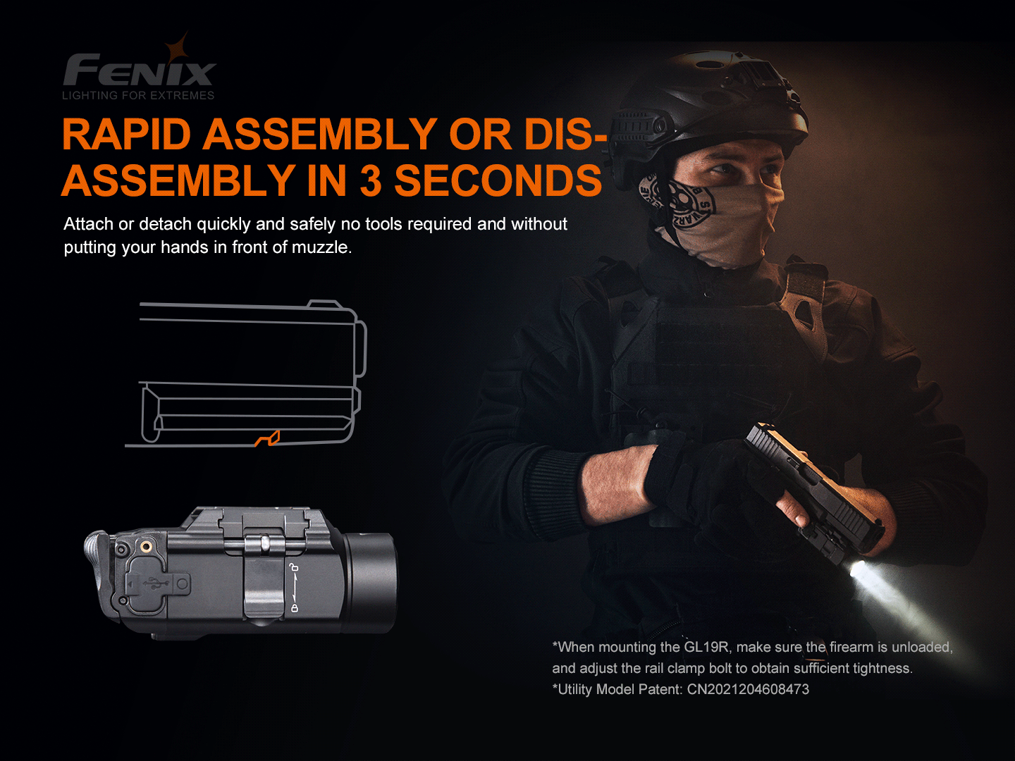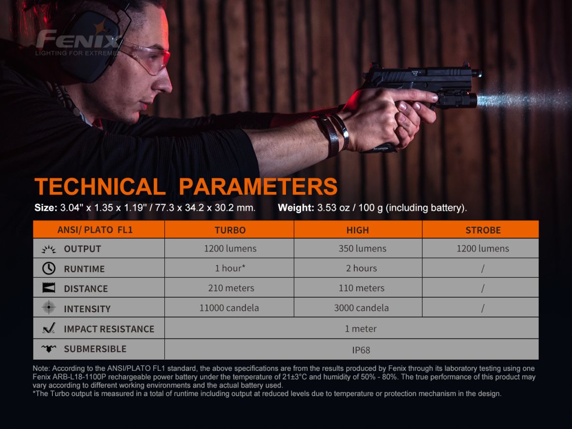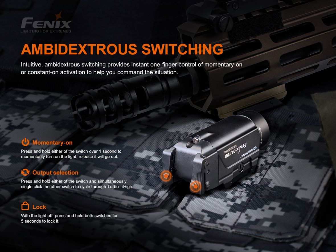 Nabíjateľné pištoľové LED svietidlo Fenix GL19R je skonštruované špeciálne pre použitie na krátkych zbraniach a v kombinácii s dialkovým spínačom AER-06S je možné ju použiť aj na zbrani dlhej vybavenej lištou štandardu Picatinny MIL-STD-1913. Ponúka špičkový výkon svetla 1200 ANSI lúmenov s dosvitom až 210 metrov. Svietidlo je napájané jedným Li-ion akumulátorom Fenix ARB-L18-1100P (veľkosť 18350), ktorý sa nabíja cez USB-C konektor priamo vo svietidle. Zjednodušené ovládanie svietidla je obojstranné (pre pravákov aj ľavákov). V prípade potreby je možné svietidlo prepnúť do nižšieho výkonu 350 lúmenov alebo ho možno okamžite prepnúť do stroboskopického blikania. Montáž na zbraňovú lištu je jednoduchá a nevyžaduje náradie – svietidlo sa nasunie na zbraňovú lištu a zaistí páčkou. Je možné ho pripevniť na zbraňové lišty štandardu Picatinny MIL-STD-1913 a GLOCK. Svietidlo je vhodné pre profesionálov, športových a hobby strelcov aj airsoft.
