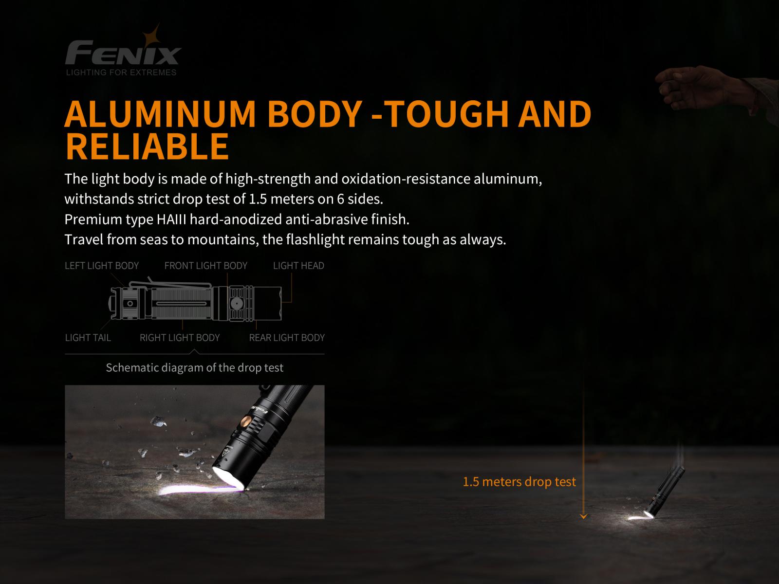 Svietidlo je napájané digitálne regulovaným konštantným prúdom pre zaručenie stáleho svetelného výkonu i pri znižovaní napätia v batériach (pri ich pozvoľnom vybíjaní). Naviac je svietidlo vybavené indikáciou stavu nabitia batérii v bočnom tlačidle. Svietidlo Fenix PD36R zaujme nielen kompaktnými rozmermi ale aj naozaj vysokým svetelným výkonom. Môžeme ho preto odporučiť aj pre použitie v bezpečnostných zložkách, pre poľovníctvo a ďalšie náročné aktivity.