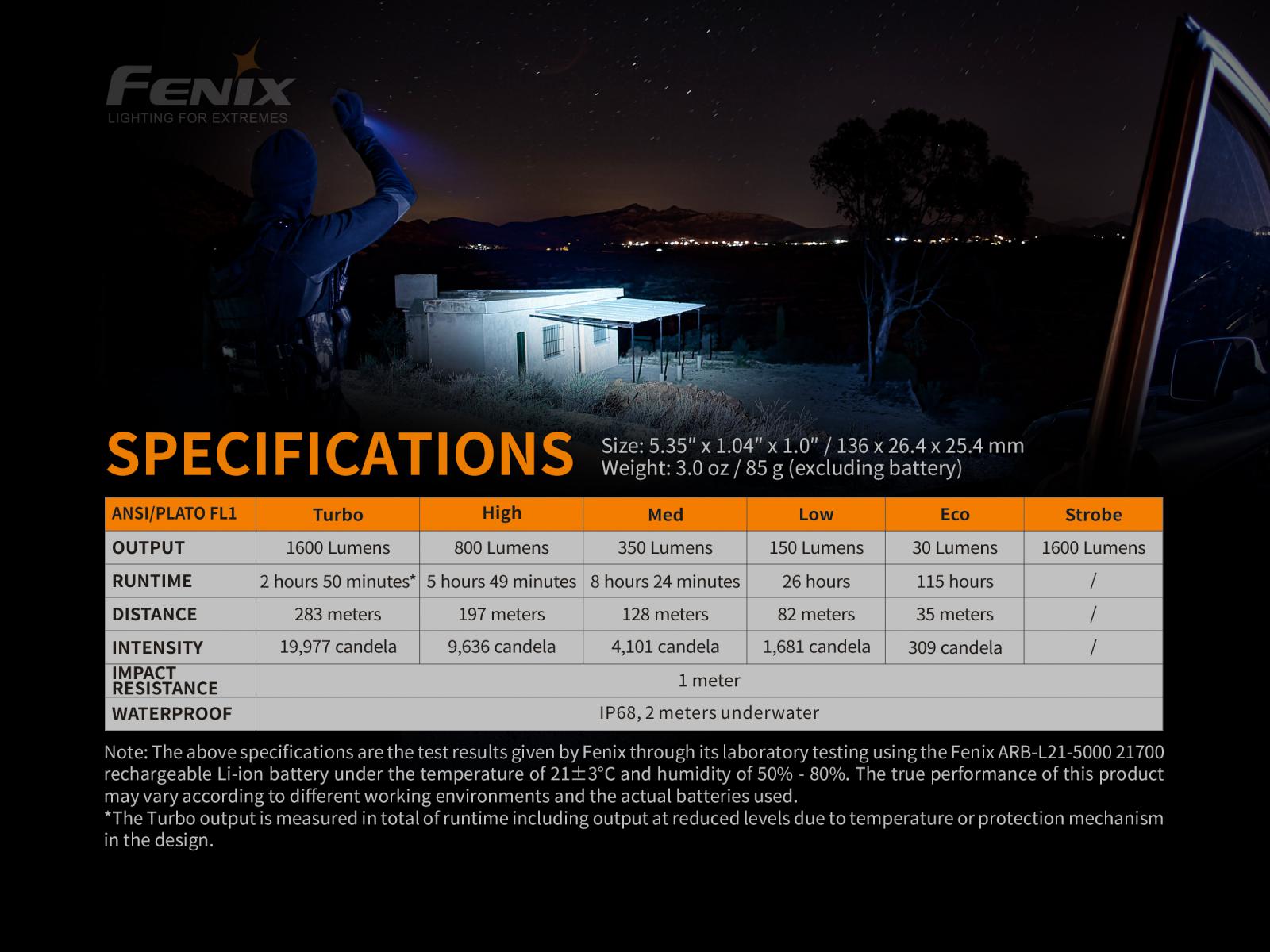 Všetky parametre baterky (svetelný tok, doba svietenia na batérie, vodotesnosť, dosvit a nárazuvzdornosť) sú merané v súlade s normou ANSI/NEMA FL 1-2009 Flashlight Basic Performance Standard.