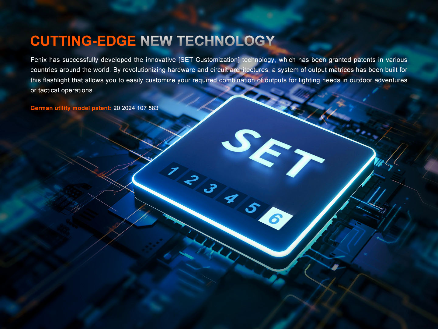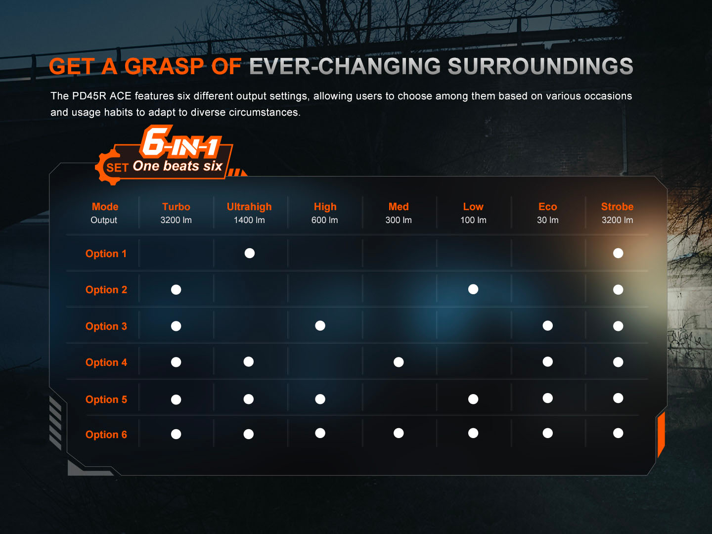 Nastavenie módov výkonu – V polohe „SET“ je možné vyberať medzi 6 módmi, ktoré obsahujú rôzne skupiny režimov výkonu viď. tabuľka nižšie. Otočte prepínačom do polohy „SET“ pre prechod do nastavenia. Svietidlo zabliká podľa aktuálne nastaveného módu, počet bliknutí svietidla zodpovedá naposledy vybranému číslu módu. Napríklad svietidlo blikne 6x, pokiaľ bol naposledy vybraný mód 6, a blikne 5x, pokiaľ bol naposledy vybraný mód 5. Plne stlačte taktický spínač pre výber módu, počet stlačení musí zodpovedať číslu vami požadovaného módu. Svietidlo potom pre potvrdenie voľby blikne toľkokrát, ako je číslo aktuálne vybraného módu. Po dokončení výberu módu si svietidlo vašu voľbu automaticky zapamätá. Otočte prepínačom do odomknutej polohy a používajte režimy podľa vami vybraného módu.