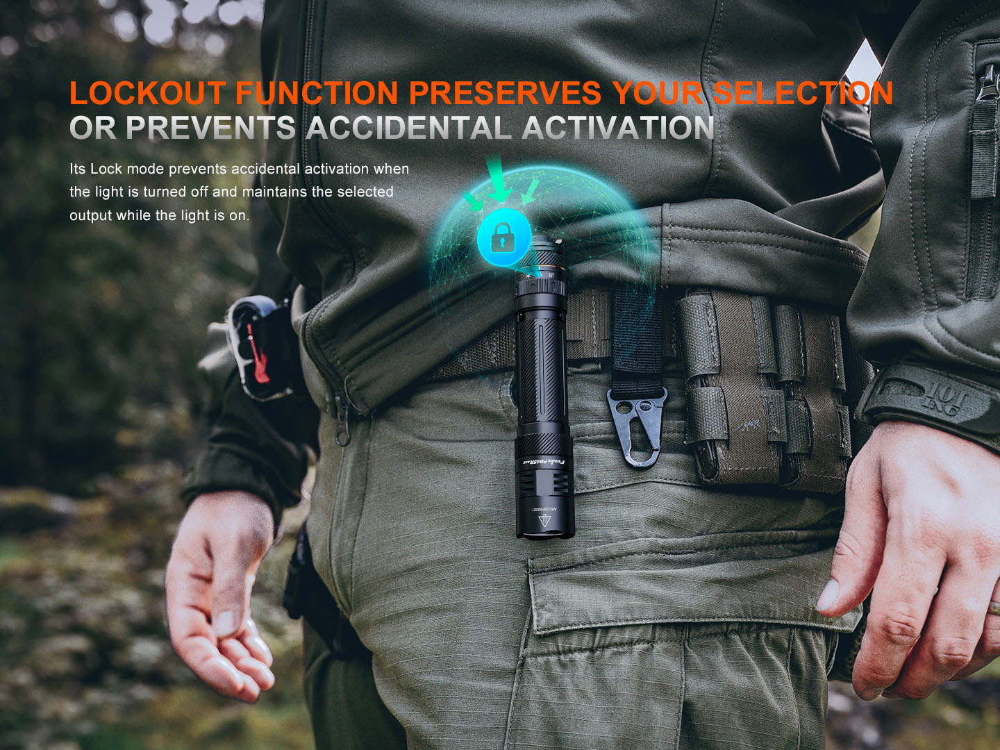 Uzamknutie/odomknutie – Pri zapnutom svetle nastavte otočný prepínač do polohy „zámok“ pre uzamknutie aktuálneho režimu svietenia. V tomto stave svietidlo na stlačenie ani pridržanie taktického spínača nereaguje a nie je možné ho vypnúť ani zmeniť výkon. Pri vypnutom svetle nastavte otočný prepínač do polohy „zámok“ pre uzamknutie taktického zadného spínača. V tomto stave nie je možné svietidlo zapnúť. Otočte prepínačom z polohy „zámok“ do ktorejkoľvek inej polohy pre odomknutie taktického zadného spínača a bežné používanie svietidla.