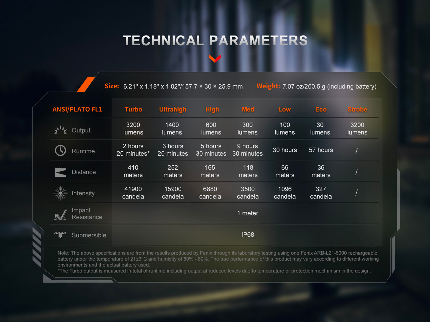 Zapnutie/vypnutie – Pokiaľ je svietidlo odomknuté, pridržte taktický spínač na konci svietidla pre tiché okamžité rozsvietenie svetla, po uvoľnení svetlo zhasne. Plne stlačte taktický spínač pre trvalé zapnutie/vypnutie svetla. Pri zapnutom svietidle je možné stlačením taktického spínača prepínať režimy výkonu v poradí: Eco (úsporný) → Nízky → Stredný → Vysoký → Veľmi vysoký → Turbo. Počet režimov, ktoré je možné prepínať, závisí od vami zvoleného módu.