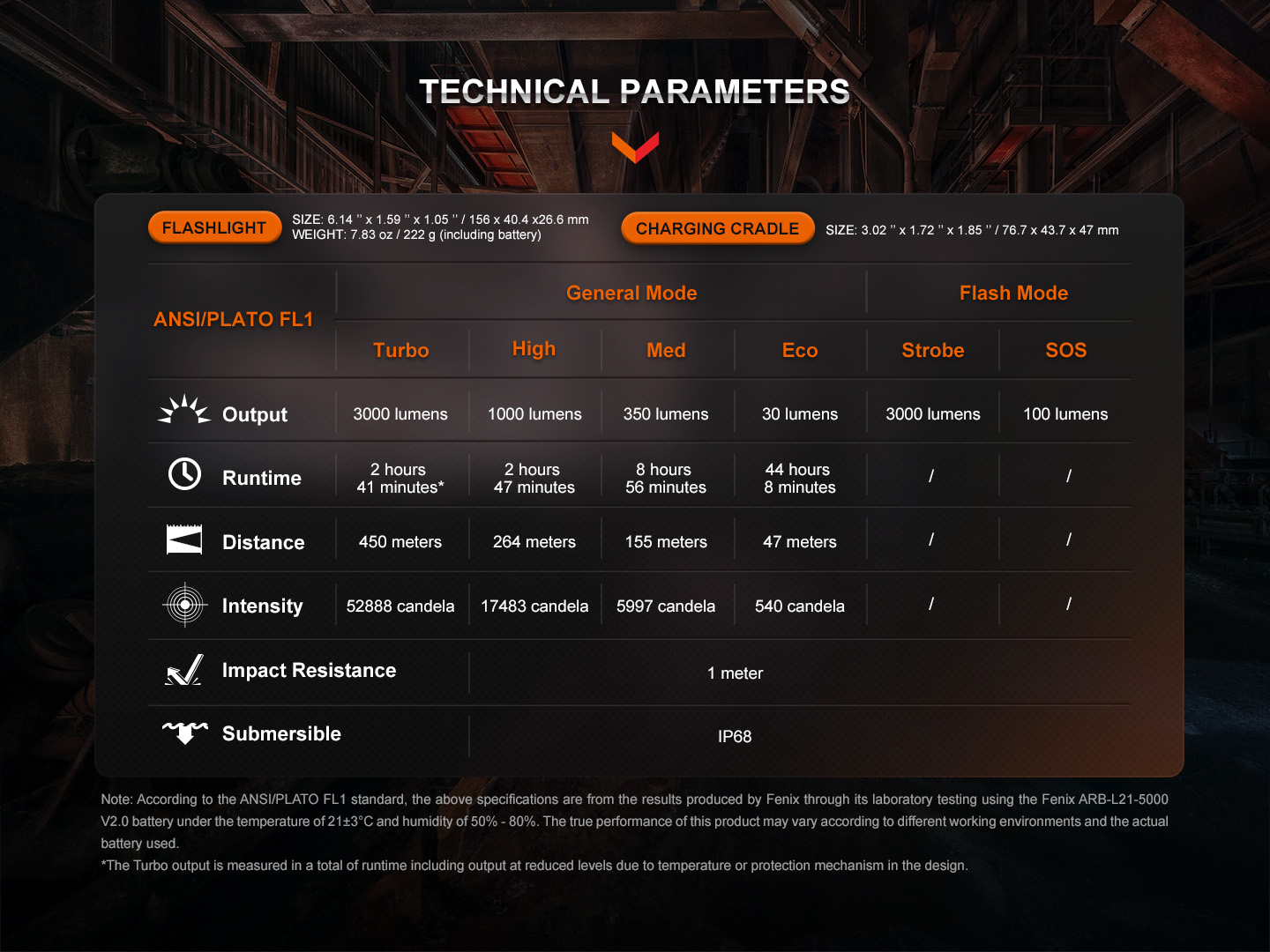 Všetky parametre svietidla (svetelný tok, doba prevádzky na batérie, vodotesnosť, dosvit a nárazuvzdornosť) sú zmerané v súlade s normou ANSI/NEMA FL 1-2009.