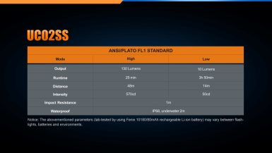 Všetky parametre svietidla (svetelný tok, doba svietenia na batérie, vodotesnosť, dosvit a nárazuvzdornosť) sú merané v súlade s normou ANSI/NEMA FL 1-2009 Flashlight Basic Performance Standard.