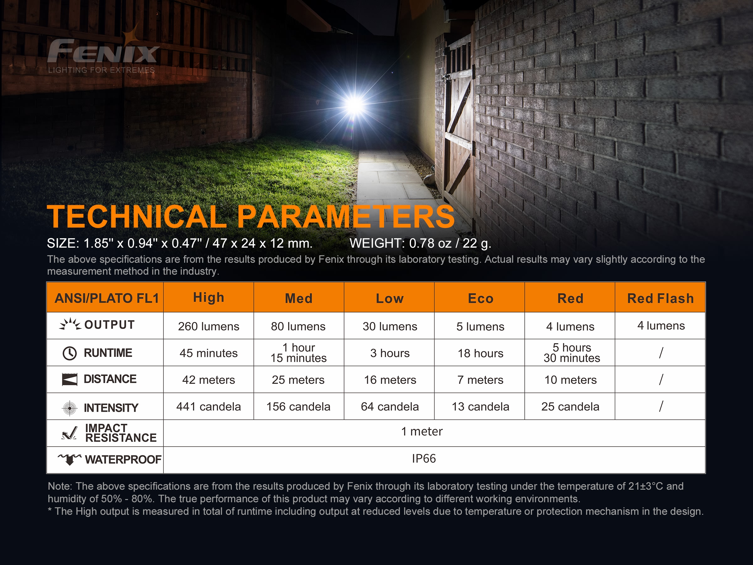 Všetky parametre baterky (svetelný tok, doba svietenia na batérie, vodotesnosť, dosvit a nárazuvzdornosť) sú merané v súlade s normou ANSI/NEMA FL 1-2009 Flashlight Basic Performance Standard.