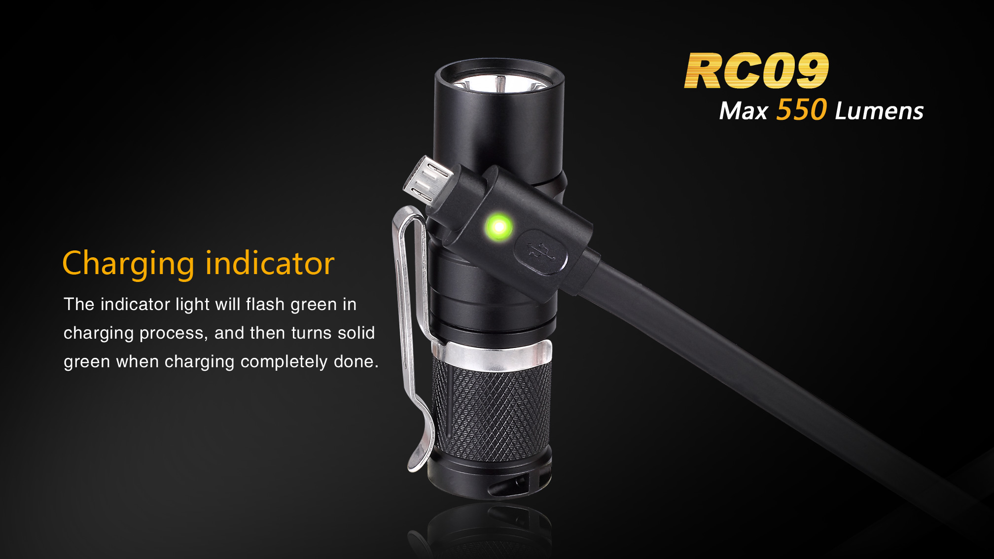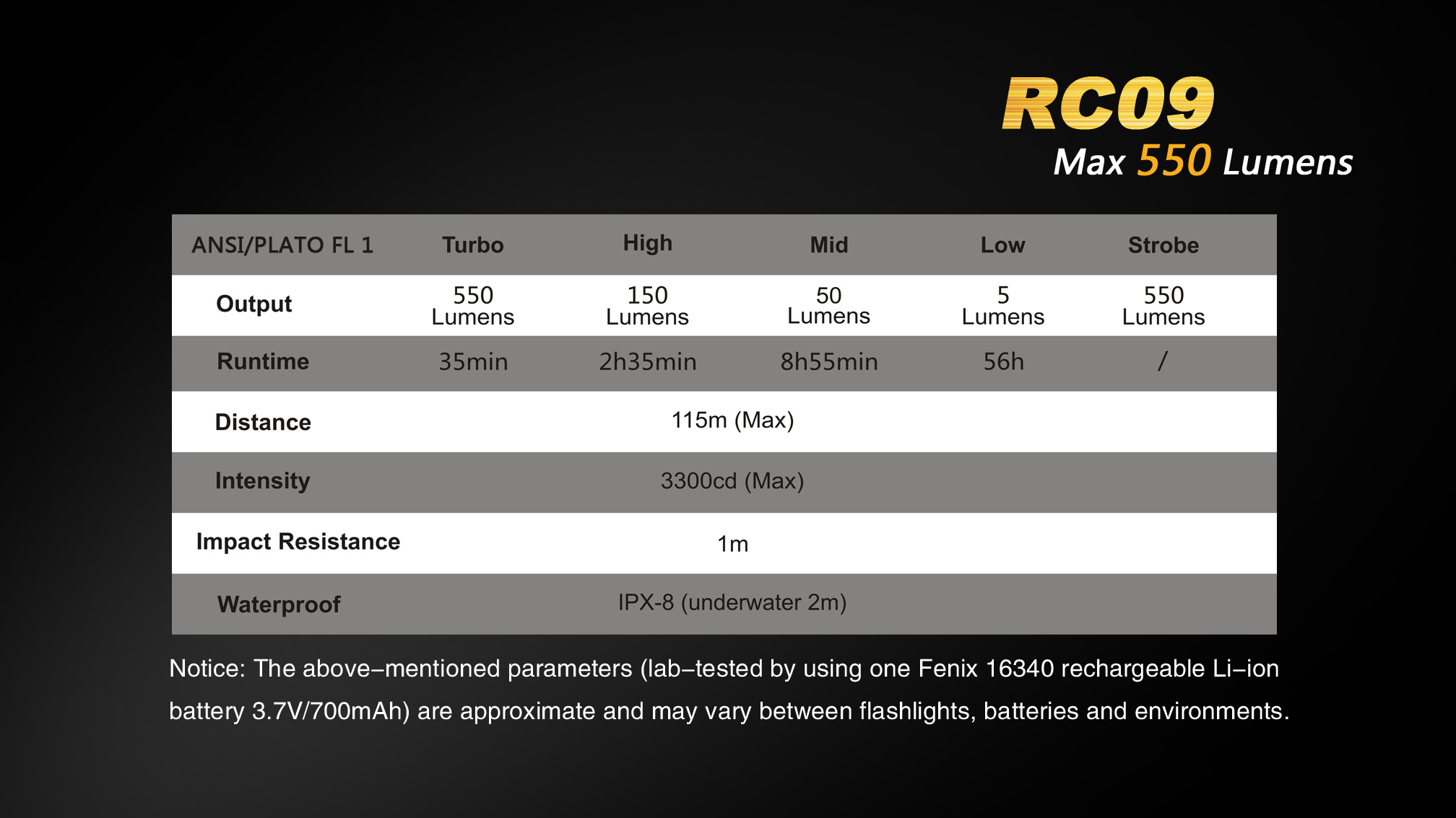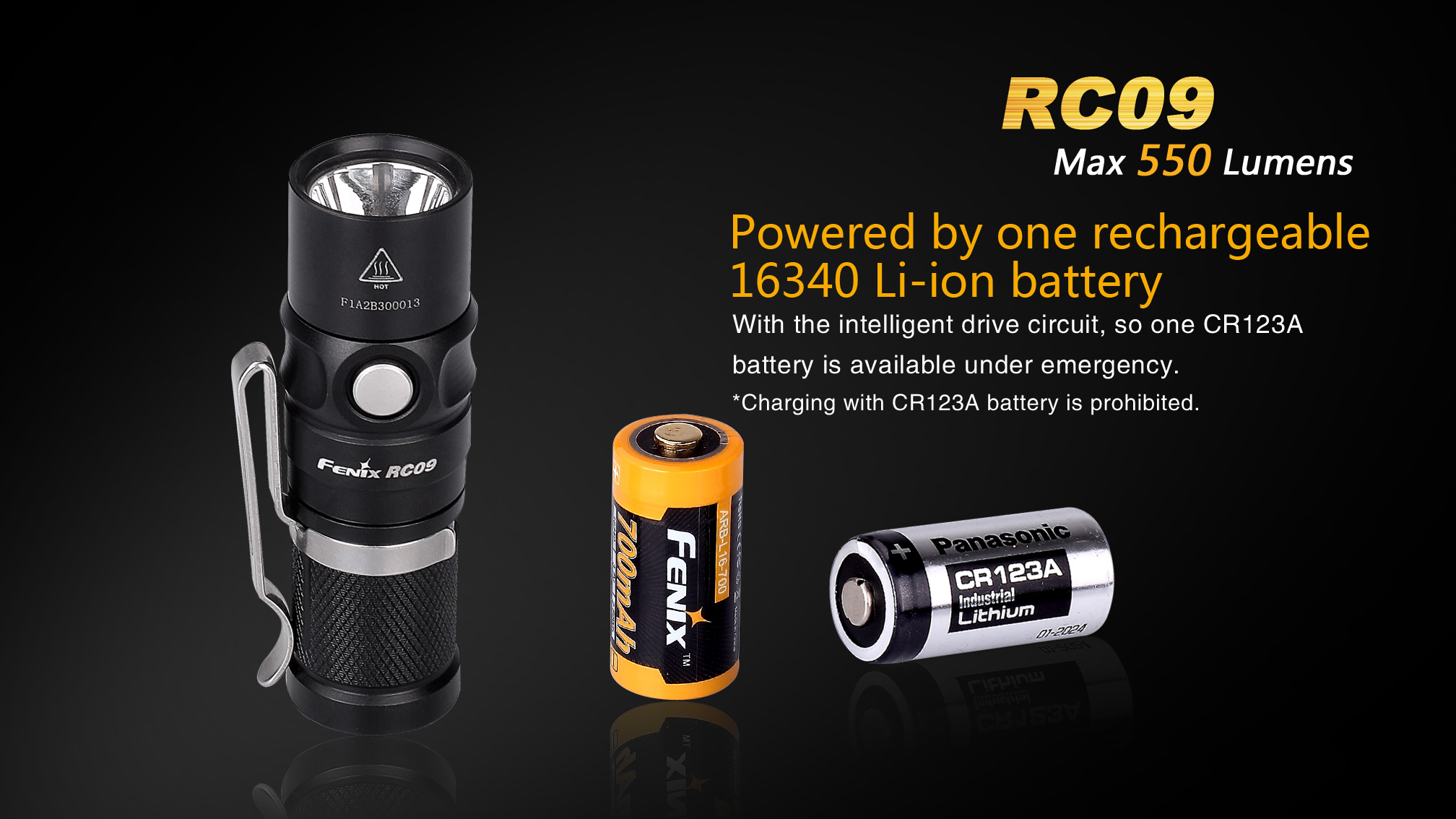 Fenix RC09 je vysoko výkonná nabíjacia vrecková baterka. Napája ju jeden nabíjací akumulátor typu RCR123A, ktorý sa nabíja priamo v baterke cez špeciálny magnetický konektor, alternatívne je možné použiť aj jednorazovú lítiovú batériu CR123A. Baterka disponuje piatimi rôznymi režimami osvetlenia, ktoré umožňujú voliť medzi vysokým výkonom a dlhou výdržou. Baterka je napájaná digitálne kontrolovaným konštantným prúdom pre zaručenie stáleho svetelného výkonu aj pri znižovaní napätia v batériách.