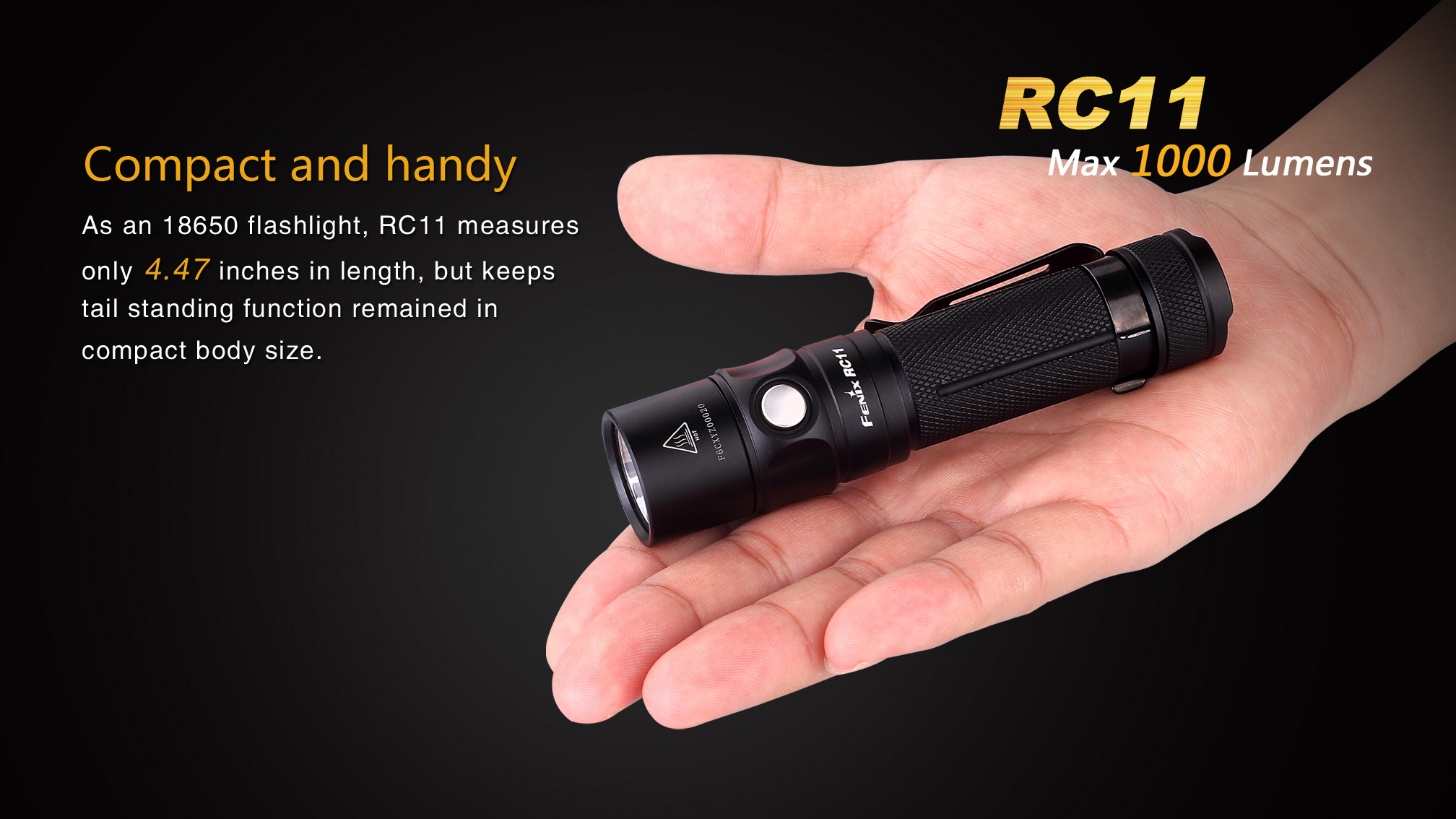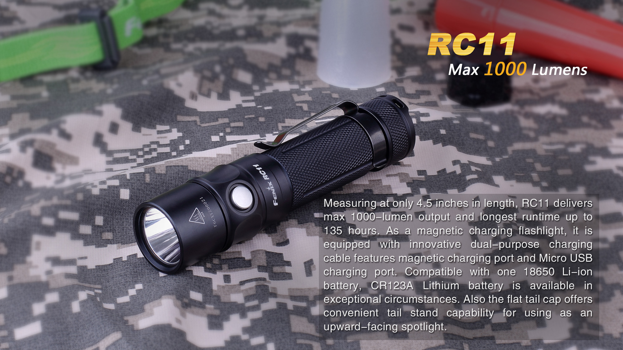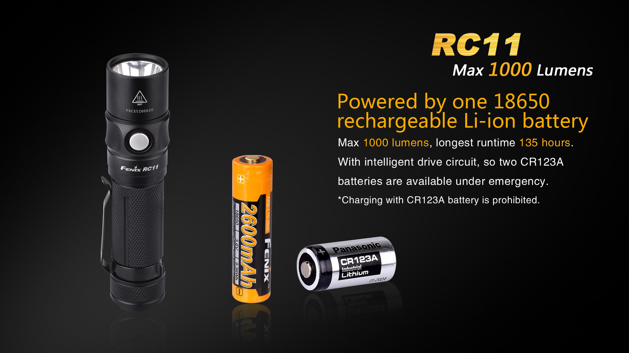 Vrecková nabíjacia baterka Fenix RC11, je napájaná li-ion akumulátorom 18650, ktorý sa dobíja priamo v baterke cez USB kábel so špeciálnym magnetickým konektorom. V núdzi je však možné svetlo napájať aj dvomi jednorazovými CR123A batériami. Baterka RC11 disponuje šiestimi rôznymi režimami svietenia, ktoré umožňujú voliť medzi vysokým výkonom a dlhou výdržou, nechýbajú ani stroboskopické záblesky pre krízové situácie. Baterka je napájaná digitálne regulovaným konštantným prúdom pre zaručenie stáleho svetelného výkonu aj pri znižovaní napätia v batériách. Tento model je vhodný pre všetkých, ktorí hľadajú čo najmänšiu a zároveň čo najvýkonnejšiu baterku.
