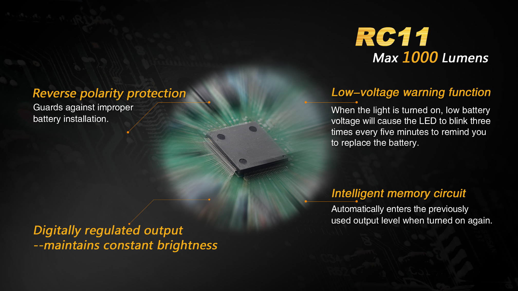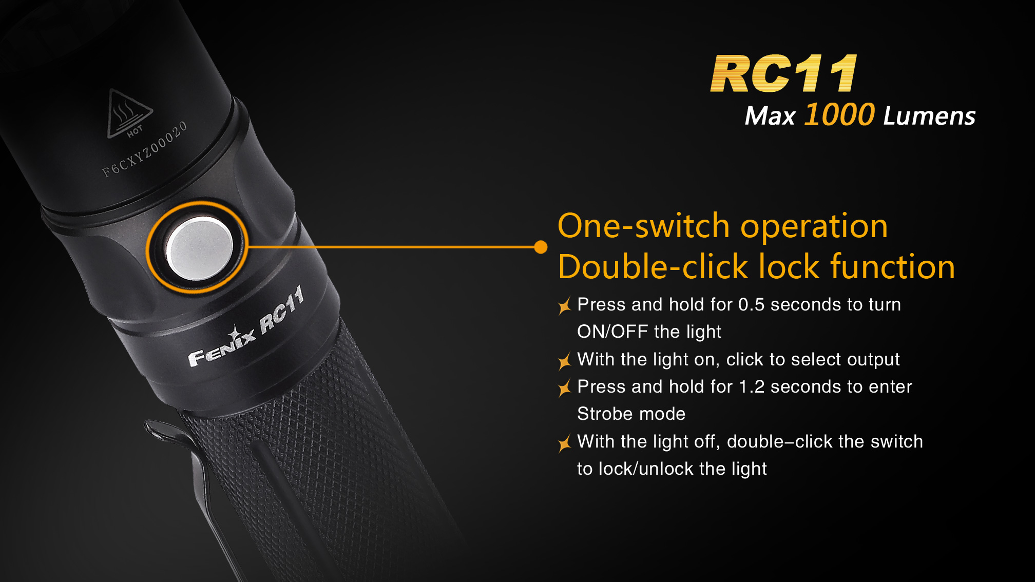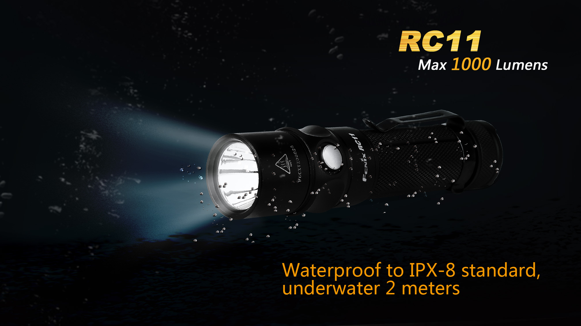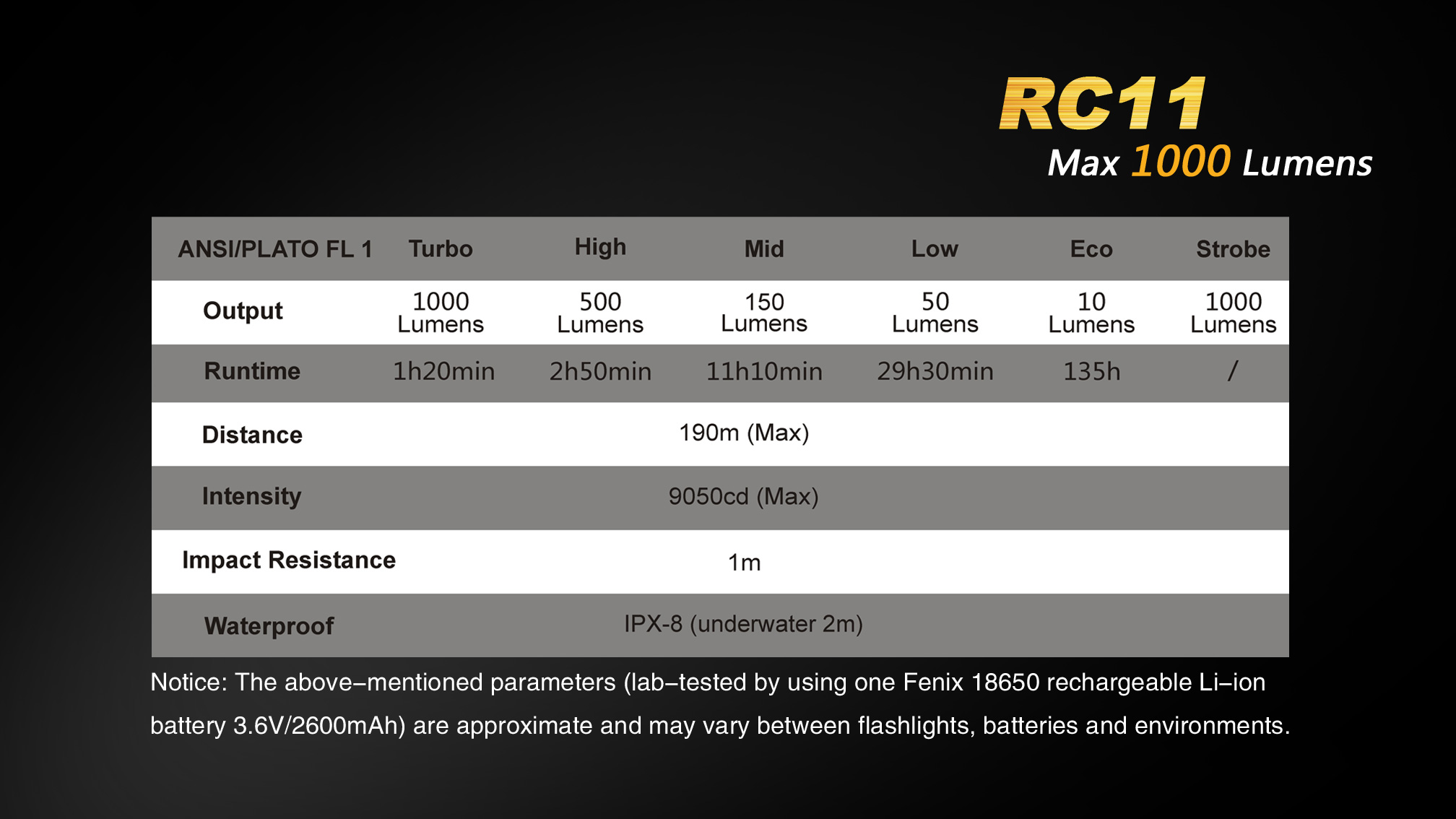 Vrecková nabíjacia baterka Fenix RC11, je napájaná li-ion akumulátorom 18650, ktorý sa dobíja priamo v baterke cez USB kábel so špeciálnym magnetickým konektorom. V núdzi je však možné svetlo napájať aj dvomi jednorazovými CR123A batériami. Baterka RC11 disponuje šiestimi rôznymi režimami svietenia, ktoré umožňujú voliť medzi vysokým výkonom a dlhou výdržou, nechýbajú ani stroboskopické záblesky pre krízové situácie. Baterka je napájaná digitálne regulovaným konštantným prúdom pre zaručenie stáleho svetelného výkonu aj pri znižovaní napätia v batériách. Tento model je vhodný pre všetkých, ktorí hľadajú čo najmänšiu a zároveň čo najvýkonnejšiu baterku.