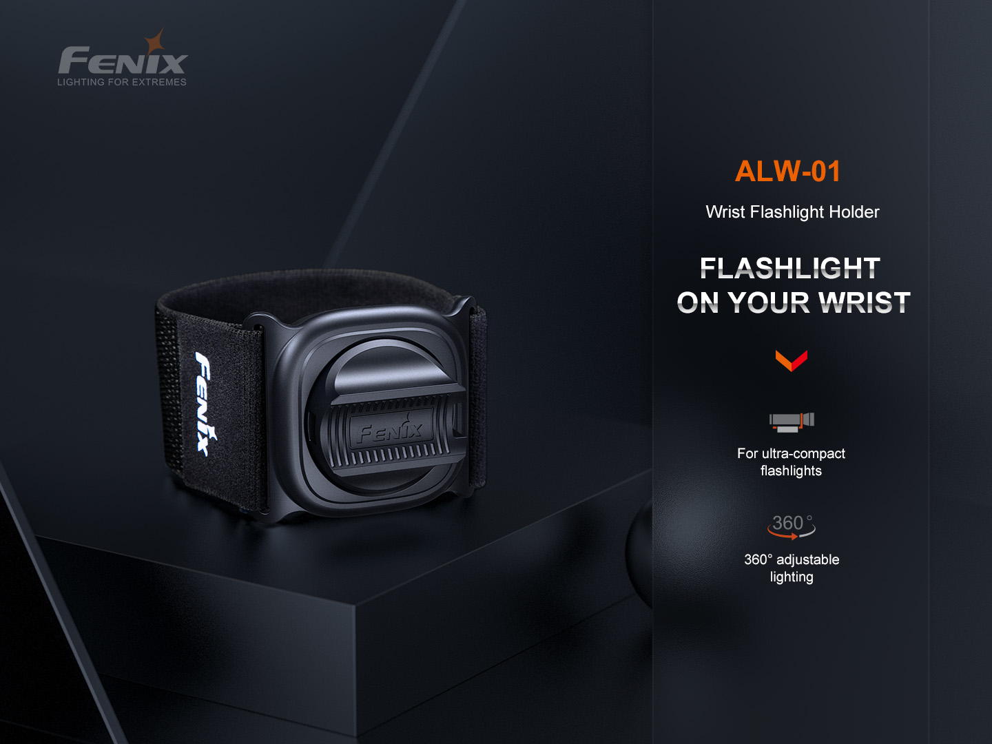 Otočný držiak na zápästie Fenix ALW-01 slúži na pripevnenie menších svietidiel na zápästie. Do držiaku sa svietidlo uchytí pomocou klipu. Možno ho použiť na uchytenie malých svietidiel vybavených sponou ako sú Fenix E12 V2.0, E16, E18R V2.0, PD25R a ďalšie. Nylonový pásik sa dá upevniť na zápästie s obvodom cca 14-20 cm. Vďaka pohyblivému držiaku je možné svietidlo otáčať v rozsahu 360°.