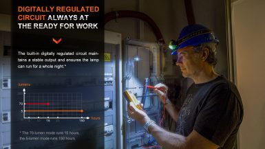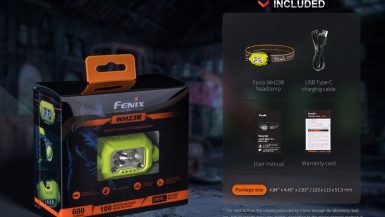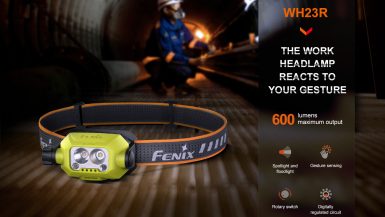 Fenix WH23R je dobíjateľná pracovná čelovka, ktorá sa vyznačuje vysokou odolnosťou voči pádu, unikátnou konštrukciou s dvoma reflektormi a funkciou pre bezdotykové zapínanie a vypínanie. Diaľkový reflektor vytvára mierne zaostrený svetelný lúč s dosvitom až 84 metrov a druhý reflektor má svetelnú stopu veľmi širokú a plynulú. Svetelný tok každého reflektora je až 300 lúmenov a ich svetlo je možné v turbo režime skombinovať do celkového výkonu 600 lúmenov. Na boku čelovky je otočný ovládač, ktorým je možné voliť štyri polohy: vypnutie – diaľkový reflektor – široký reflektor – turbo režim. V polohách širokého a diaľkového reflektora je možné prepínať vždy tri stupne výkonu tlačidlom, ktoré je ukryté v otočnom ovládači.