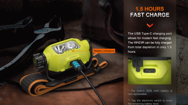 Nová funkcia Gesture-sensing umožňuje vypínať a zapínať svetlo mávnutím ruky vo vzdialenosti cca 10 centimetrov pred čelovkou. Takže môžete mať pri práci ruky od blata, olejov, čohokoľvek a svietidlo zostane stále čisté. Na napájanie používa zabudovaný Li-pol akumulátor s kapacitou 2000 mAh, ktorý sa nabíja cez moderný USB-C konektor priamo v čelovke.