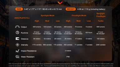 Všetky parametre svietidla (svetelný tok, doba prevádzky na batérie, vodotesnosť, dosvit a nárazuvzdornosť) sú zmerané v súlade s normou ANSI/NEMA FL 1-2009.
