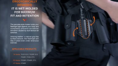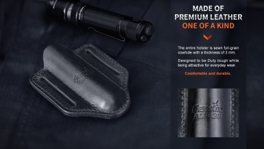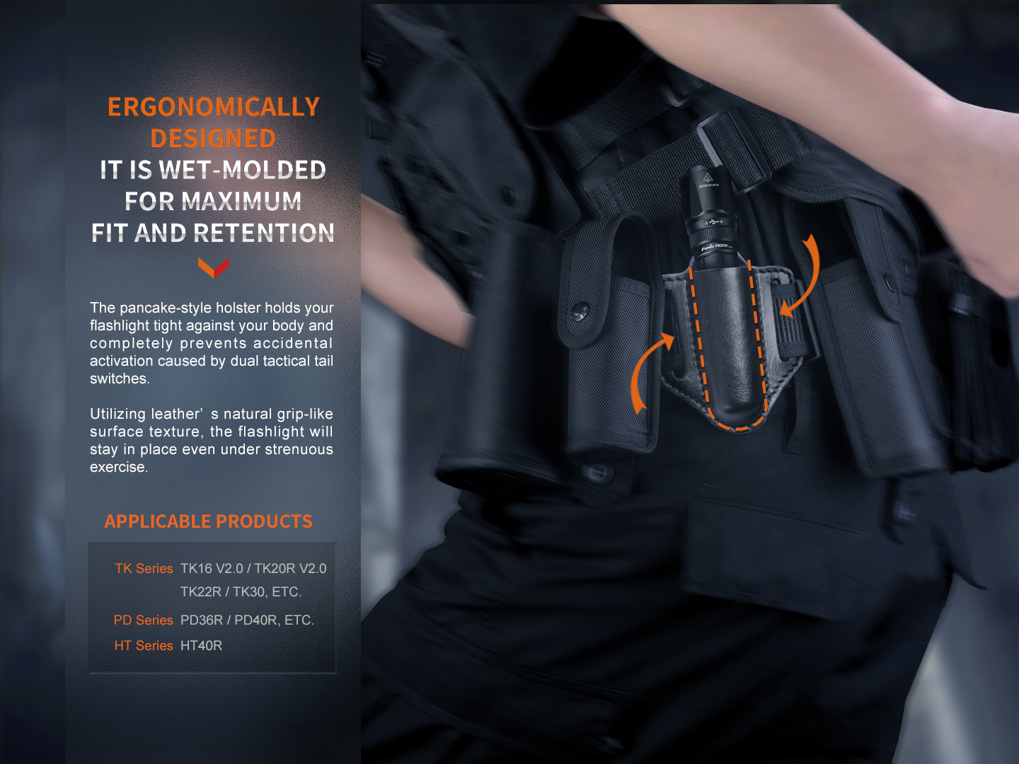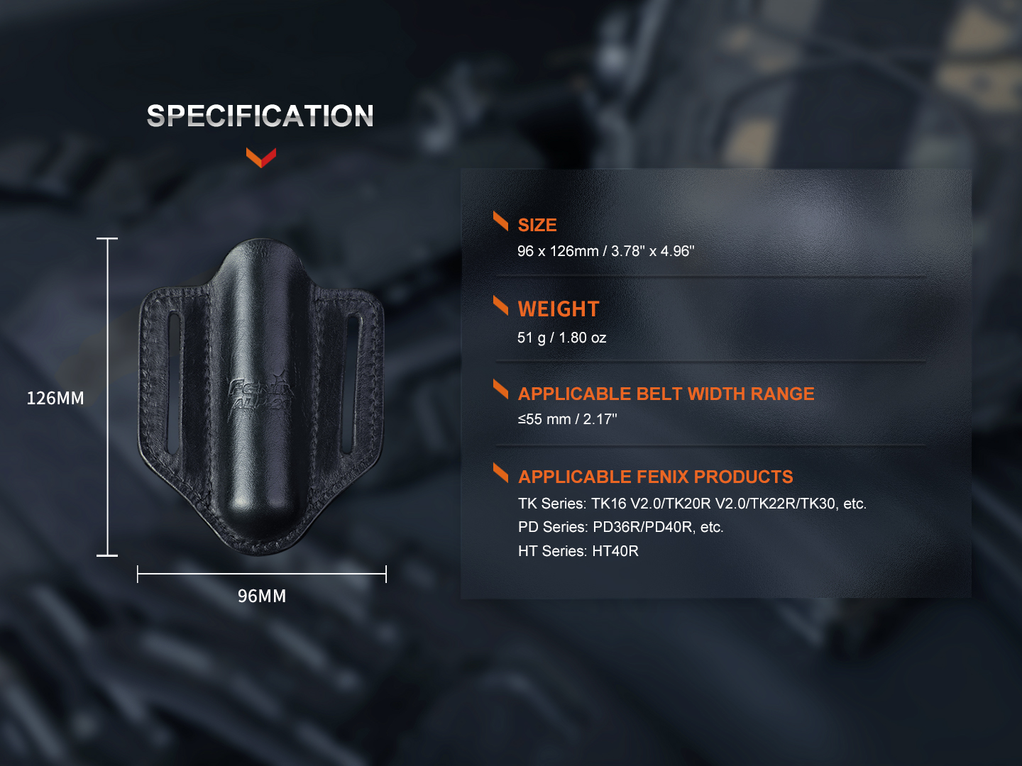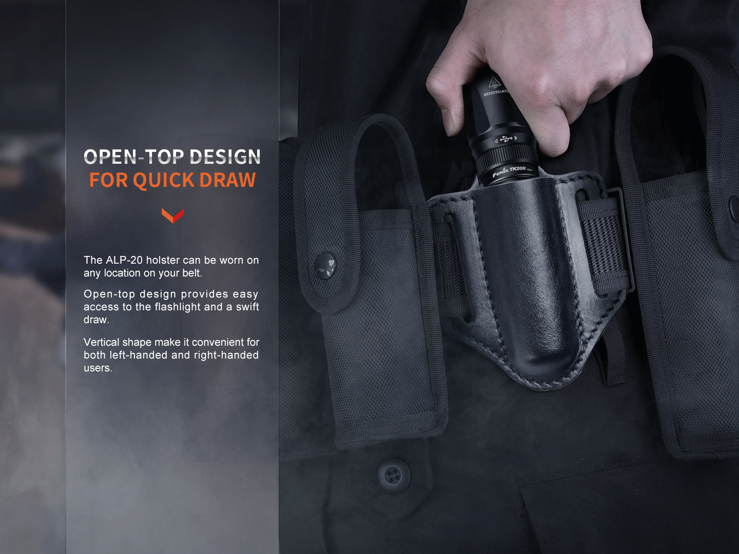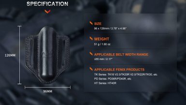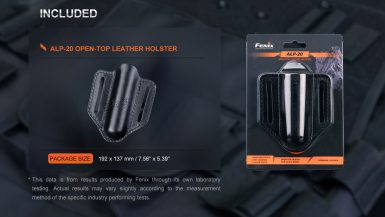 Puzdro Fenix ALP-20 je vyrobené z prémiovej kože. Je vhodné napríklad pre svietidlá Fenix TK11R, PD36 V2.0, PD36R PRO, PD36 TAC, TK16 V2.0, TK20R V2.0, TK22R, TK22 TAC, TK30, HT40R a ďalšie svietidlá s palcovým priemerom tela a sponou. Okrem toho je možné v púzdre nosiť zatváracie nože, multináradie a ďalšie príslušenstvo do rovnakej maximálnej veľkosti. Puzdro sa dá upevniť na opasky do šírky 5,5 centimetra.