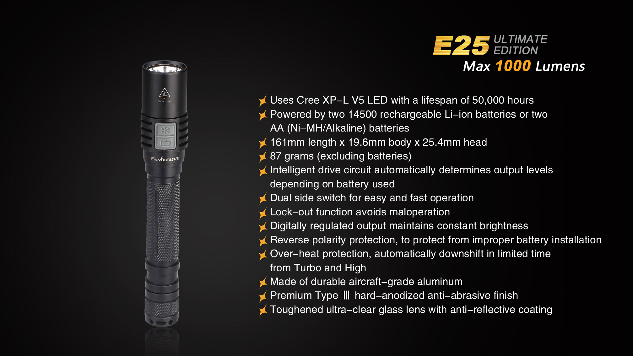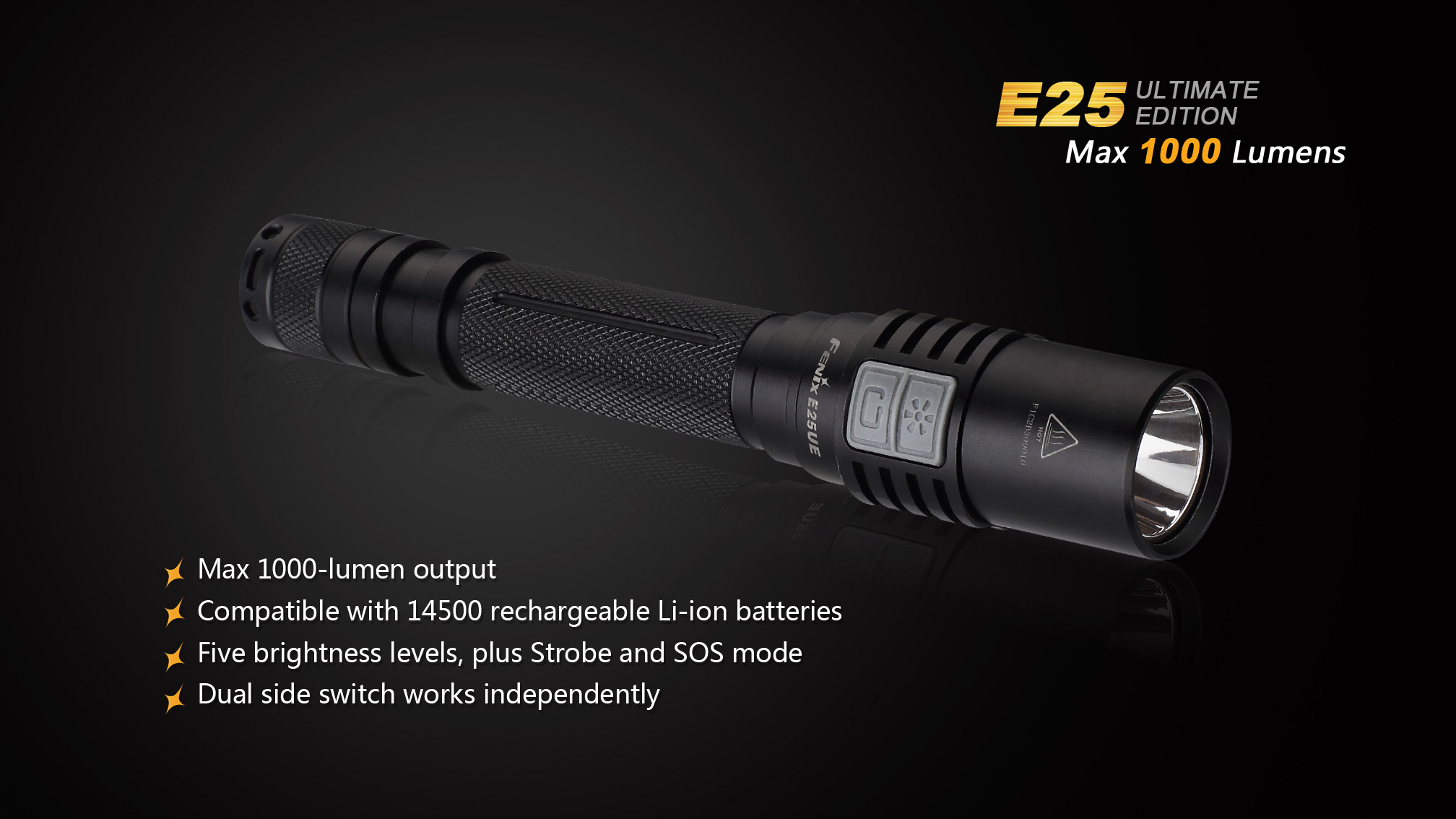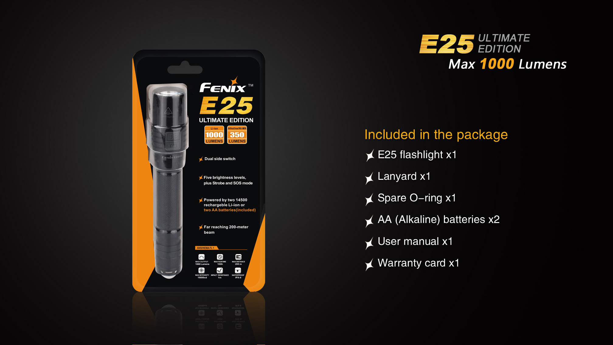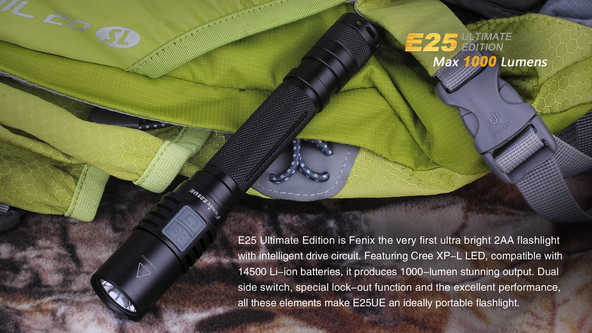 Praktický lampáš Fenix E25 UE na dve tužkové batérie, alebo dva li-ion akumulátory 14500 je vhodný na každú príležitosť. Ohromujúci svetelný tok až 1000 lúmenov, dlhá doba výdrže až 100 hodín a napájanie na bežne dostupné tužkové batérie robia zo svietidla univerzálneho pomocníka do domácnosti aj do prírody. Široká škála príslušenstva predurčuje baterku takmer k akémukoľvek použitiu. Fenix E25 UE je ideálnym svetelným nástrojom s vynikajúcim pomerom ceny a výkonu.