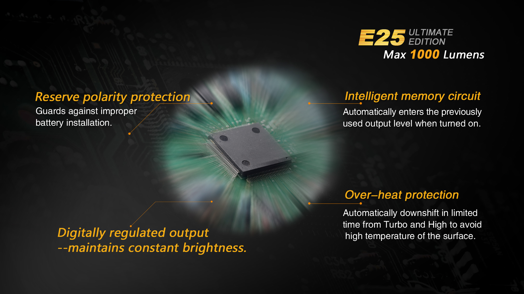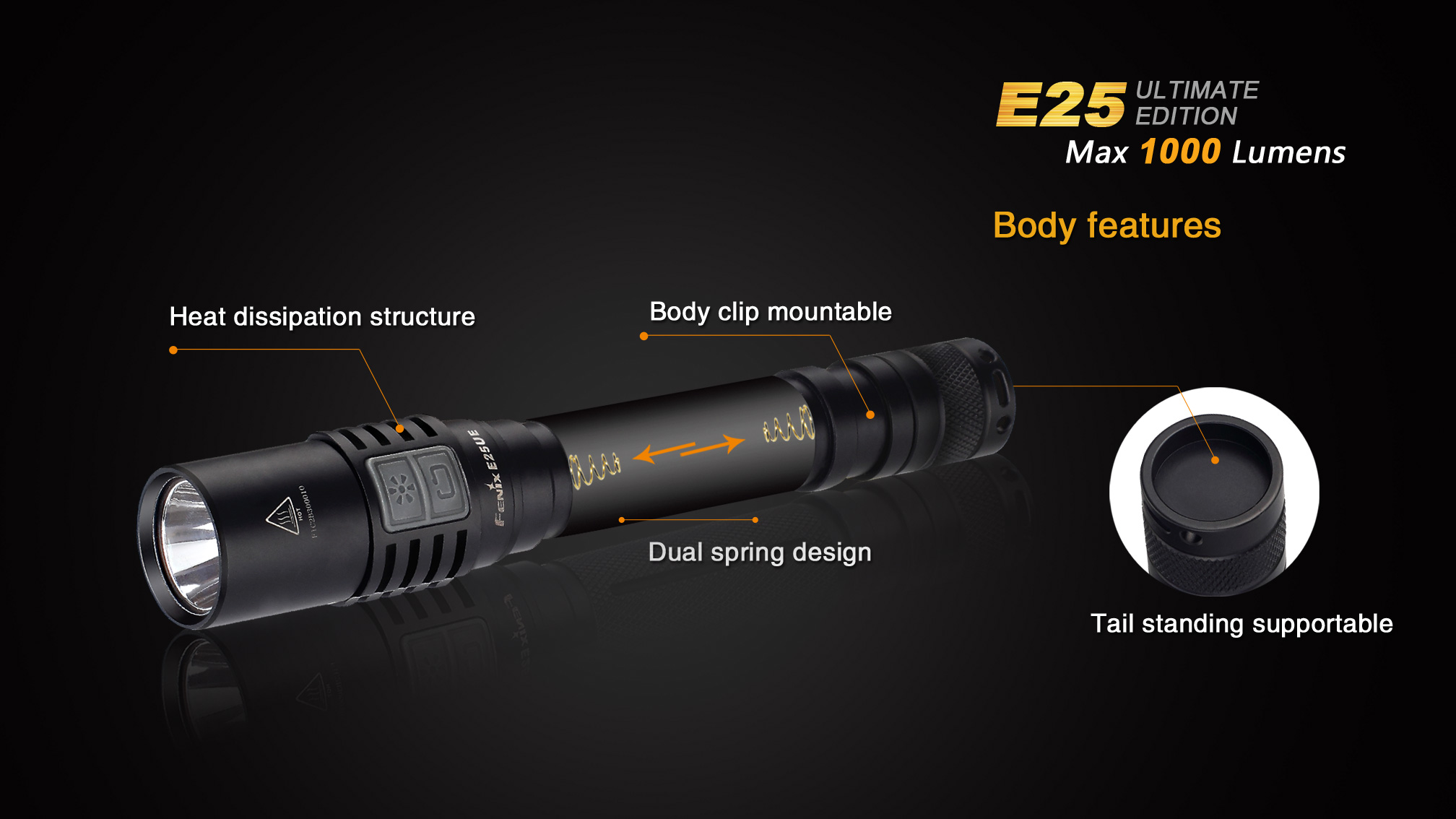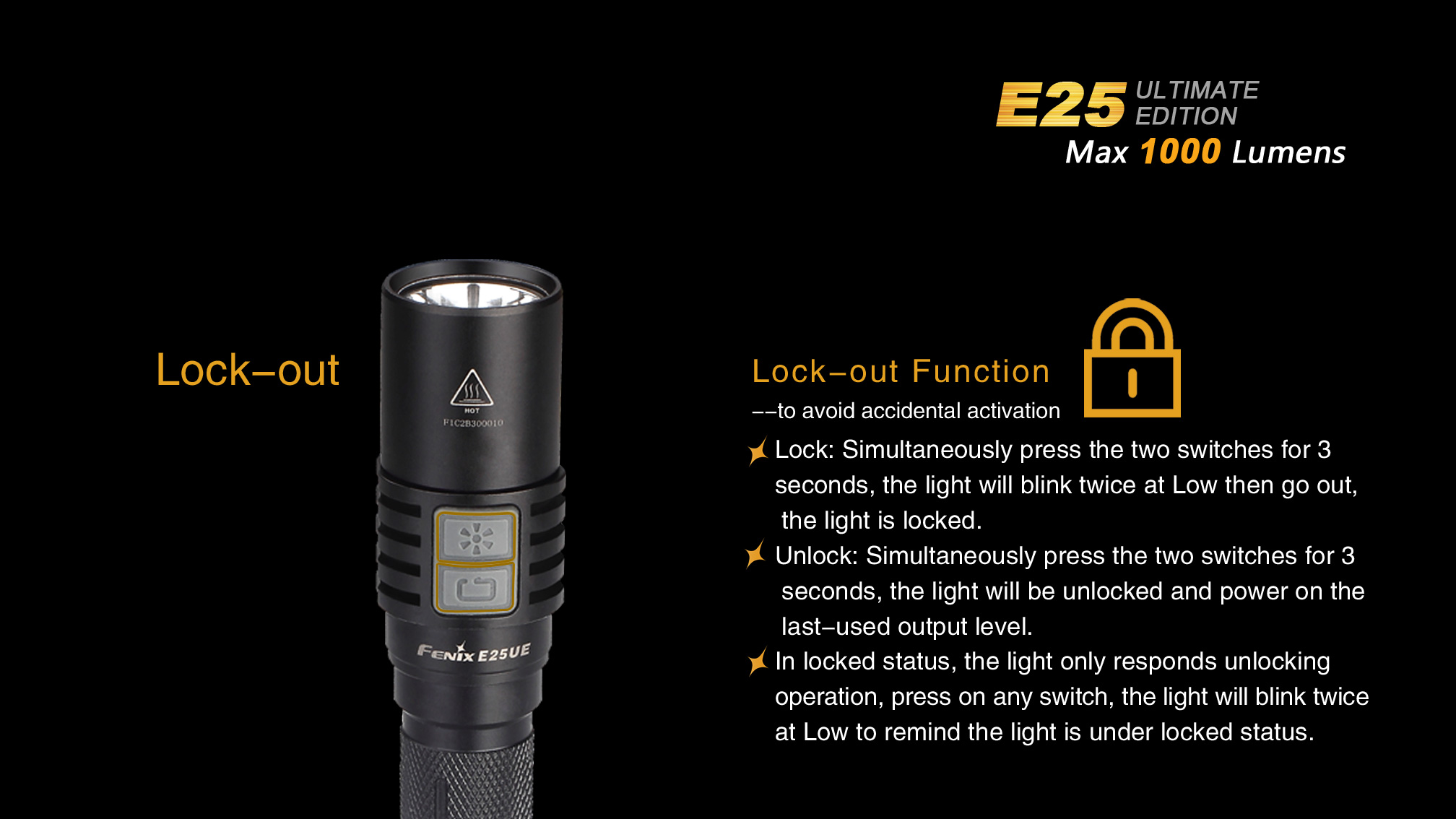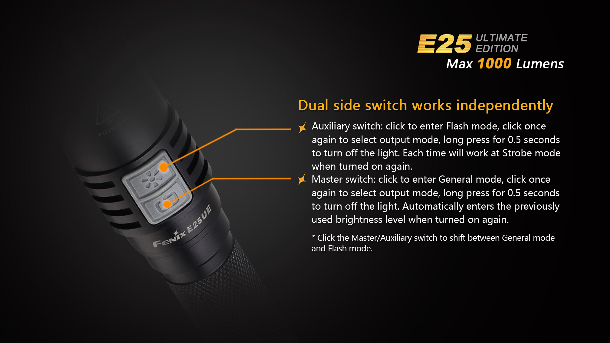 Praktický lampáš Fenix E25 UE na dve tužkové batérie, alebo dva li-ion akumulátory 14500 je vhodný na každú príležitosť. Ohromujúci svetelný tok až 1000 lúmenov, dlhá doba výdrže až 100 hodín a napájanie na bežne dostupné tužkové batérie robia zo svietidla univerzálneho pomocníka do domácnosti aj do prírody. Široká škála príslušenstva predurčuje baterku takmer k akémukoľvek použitiu. Fenix E25 UE je ideálnym svetelným nástrojom s vynikajúcim pomerom ceny a výkonu.