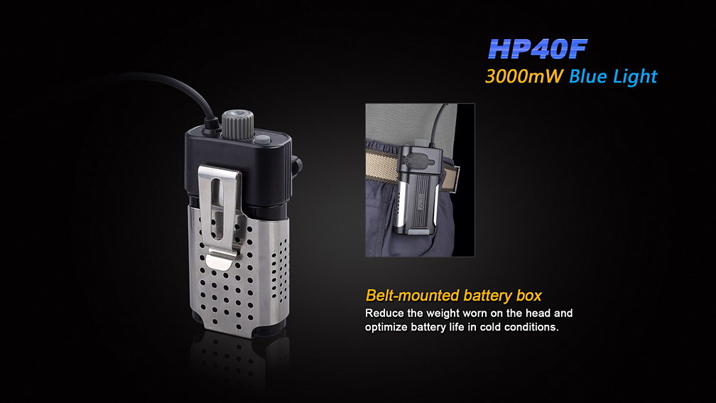 Na napájanie je možné použiť dva vysokokapacitné li-ion akumulátory typu 18650 alebo štyri lítiové CR123A batérie. Batérie sú umiestnené v oddelenom puzdre na dlhom kábli, ktoré možno umiestniť na opasok, do kapsy a alebo batohu. Zvyšuje sa tým komfort nosenia a v zime sú batérie lepšie chránené proti mrazu. Batériové puzdro je vybavené indikátorom kapacity batérií a USB výstupom, takže ho môžete využiť i ako prenosný zdroj energie k nabíjaniu vášho mobilného telefónu alebo GPS navigácie.