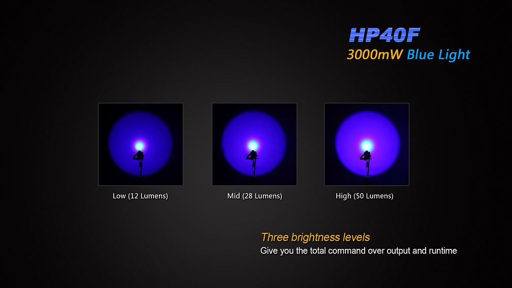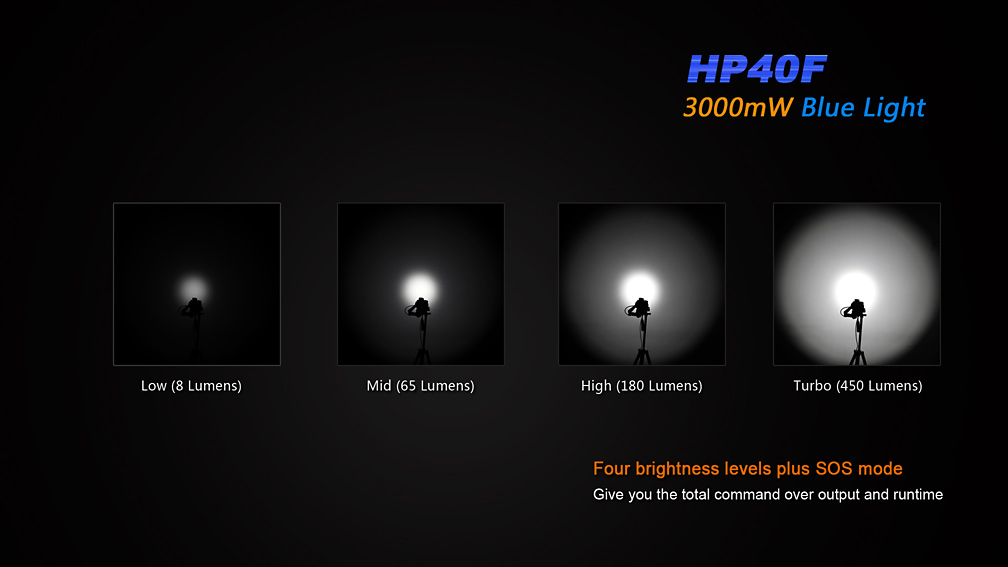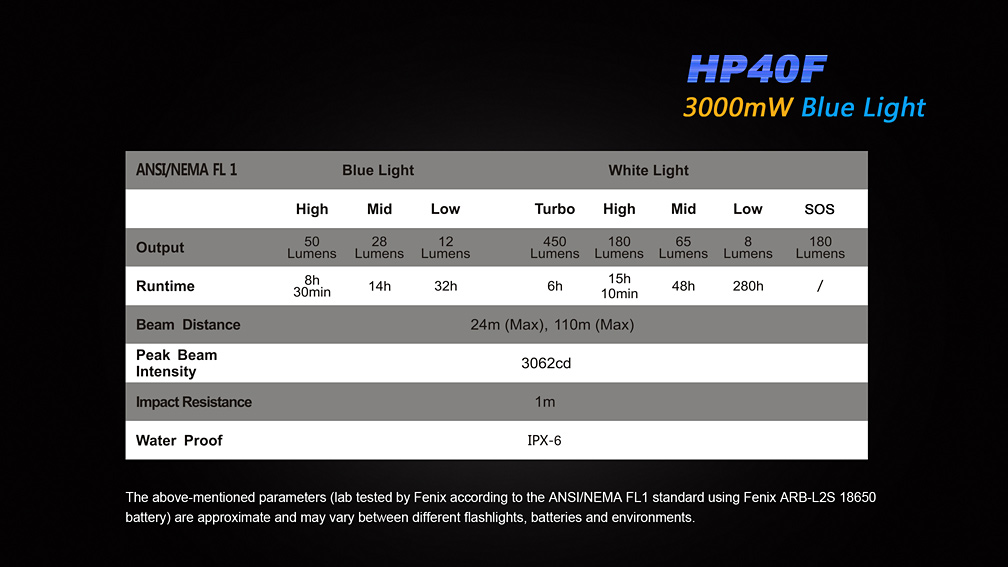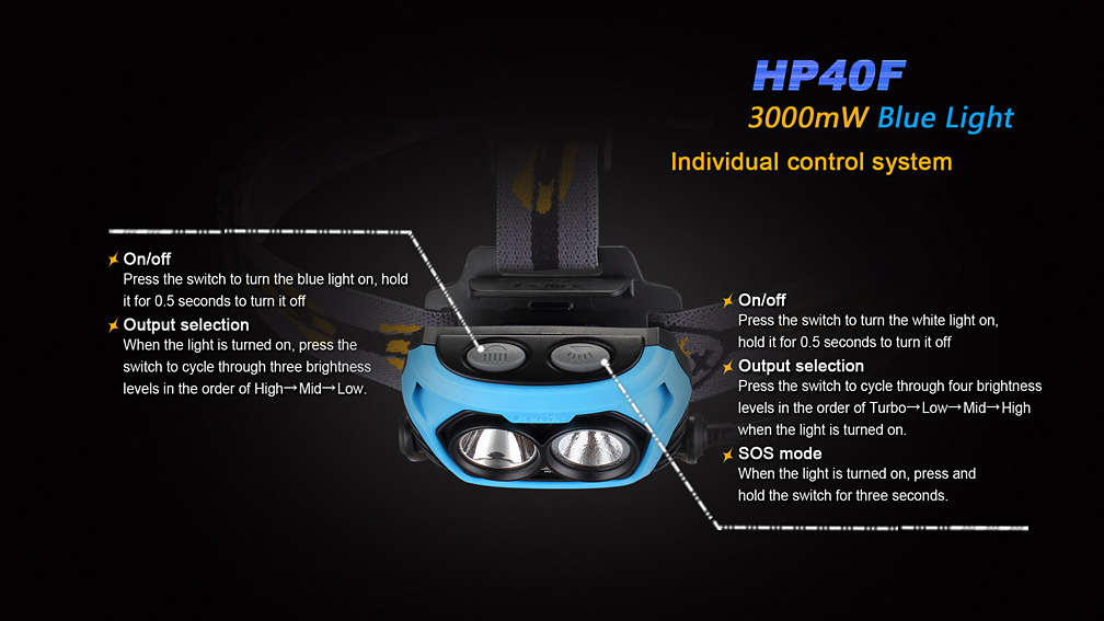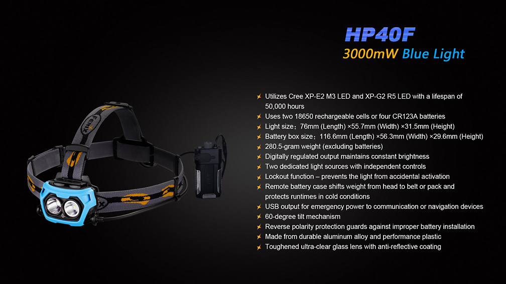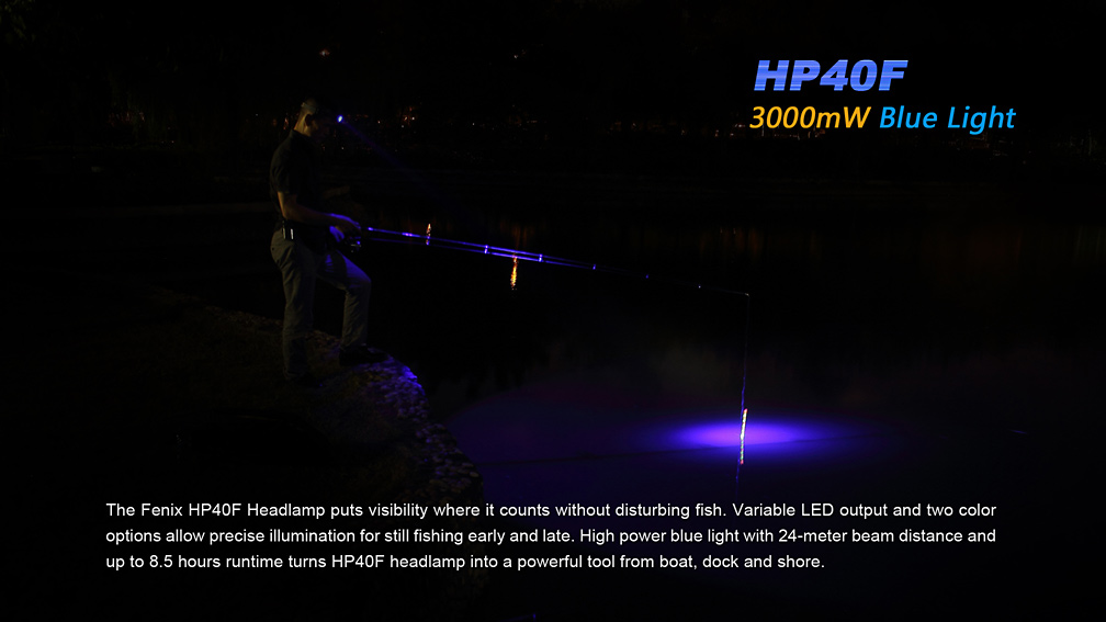 Čelovka Fenix HP40F bola skonštruovaná špeciálne pre rybárov. Jeden z dvojice reflektorov je osadený výkonnou modrou LED, ktorej svetlo neruší ryby. Druhý reflektor je osadený bielou diódou Cree XP-G2, ktorá ponúka svetelný tok až 450 lúmenov a dosvit 110 metrov. Ovládanie oboch LED je na sebe nezávislé, takže je možné oba svetelné kužele ovládať samostatne. Biely reflektor ponúka štyri stupne svietenia a SOS záblesky a modrý disponuje tromi stupňami svietenia.